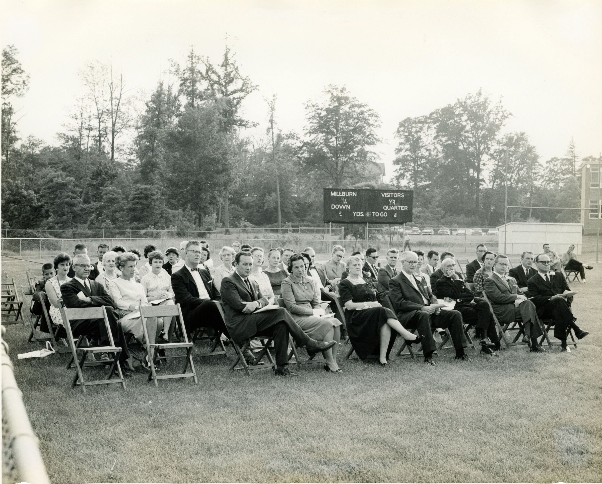 Photograph of Robert and Sarah Faddis seated (Front Row: 3rd and 4th from left) on the athletic field during the Millburn High School commencement exercises on June 22, 1961. Robert Faddis retired in June 1961 after serving the Millburn Public Schools for 37 years.Collection