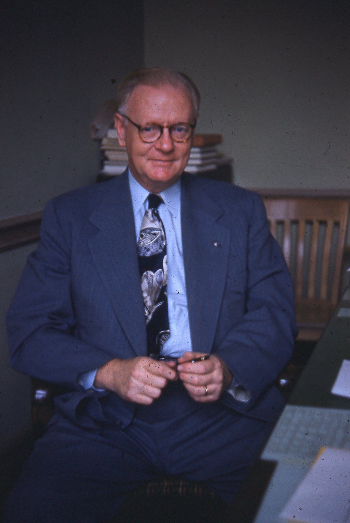 Photograph of Mr. Robert E. Faddis, Principal of Millburn High School taken on December 22, 1953. Photograph was taken at the 1953 Kris Kringle celebration.Photograph Details