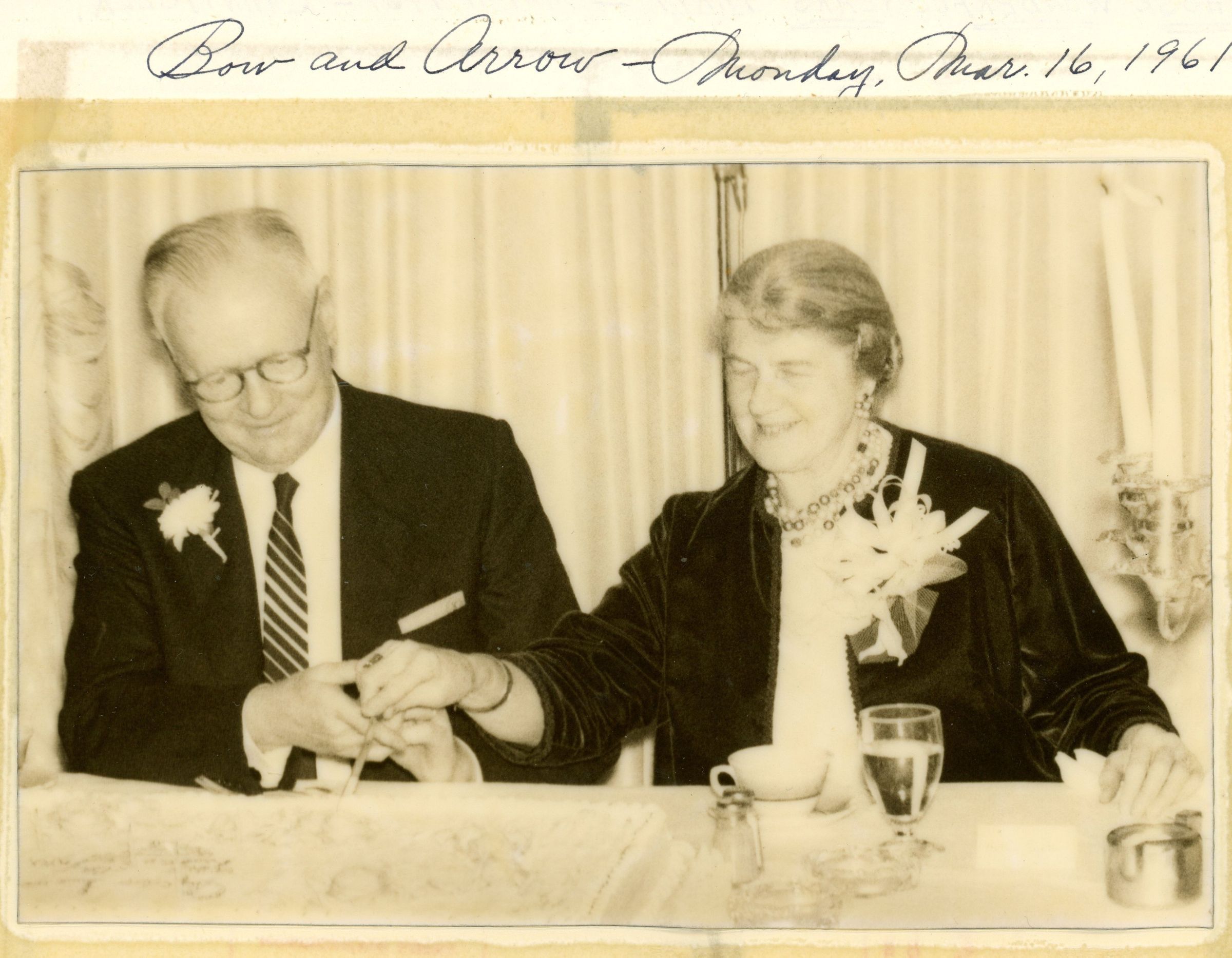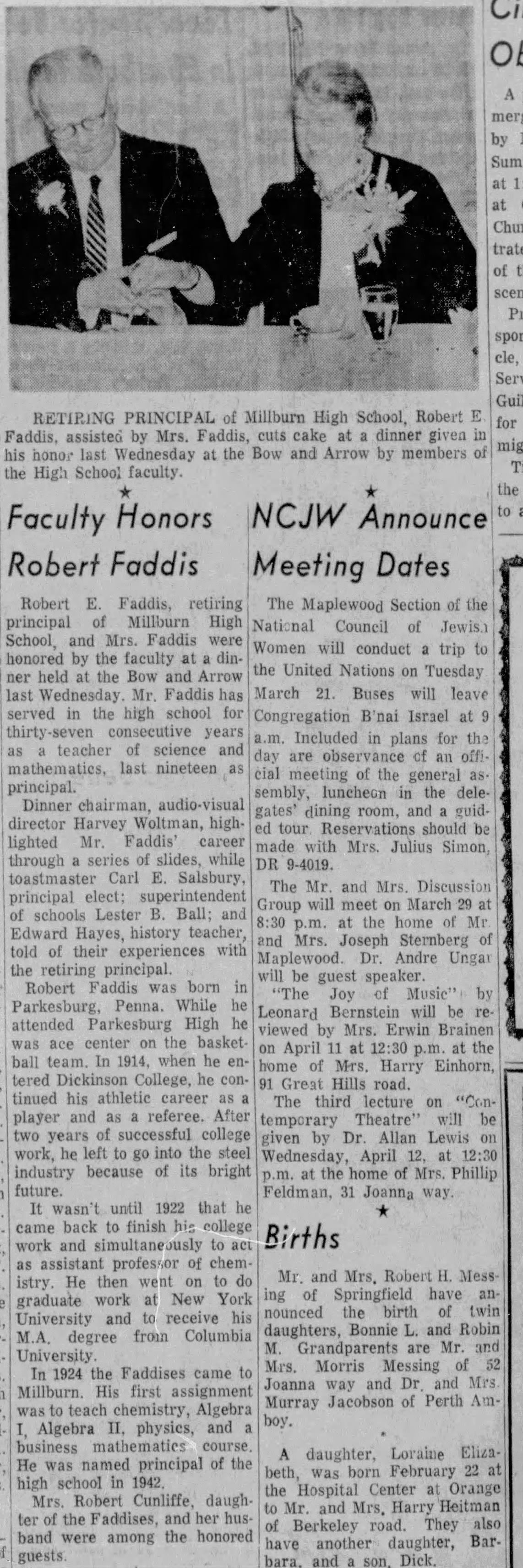 Photograph of Robert and Sarah Faddis at faculty dinner at the Bow and Arrow restaurant in their honor on March 16, 1961. The dinner was held by faculty members in honor of Faddis's retirement from the Millburn public schools in June 1961.Collection