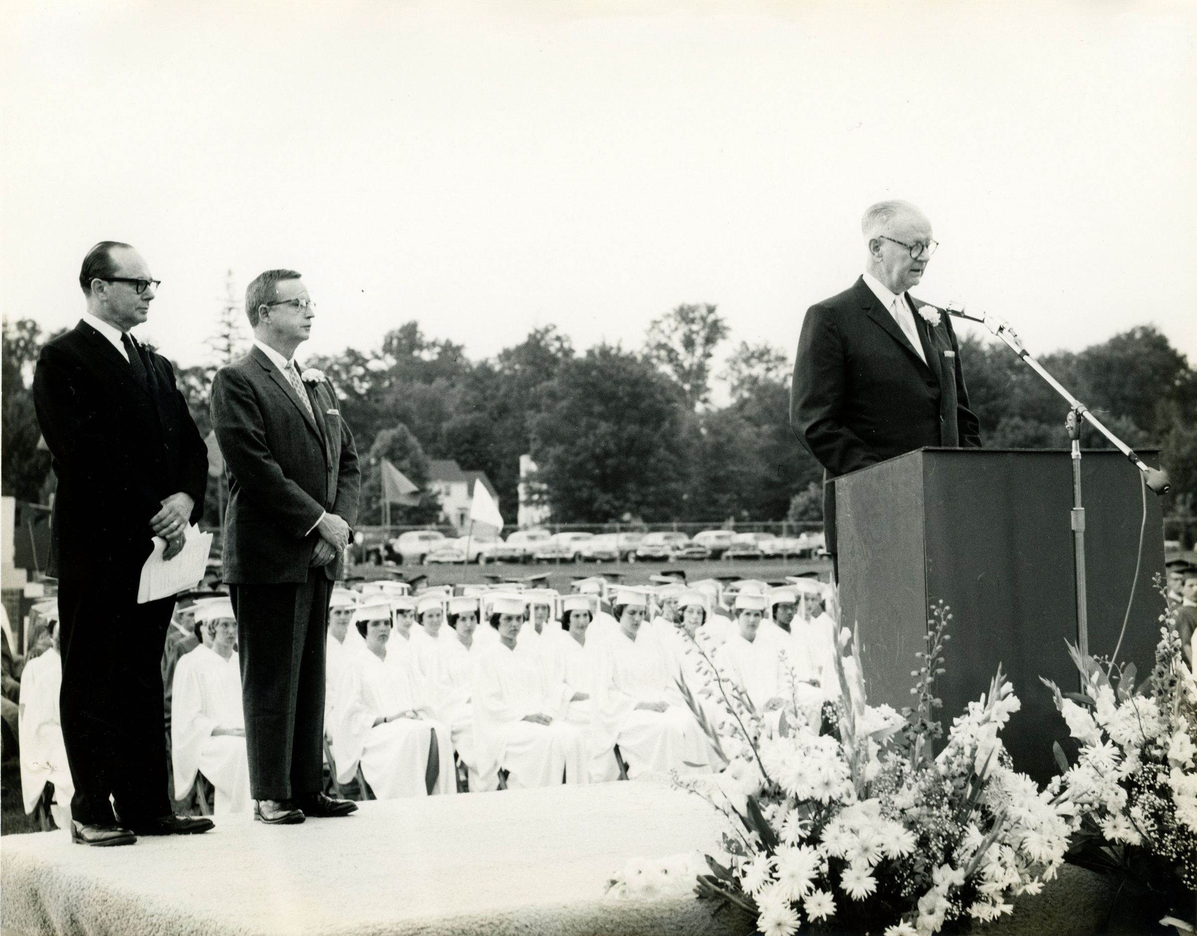 Photograph of Millburn High School Principal Robert Faddis delivering his final speech at the Millburn High School Graduation, June 22, 1961. Behind him stand Superintendent of Schools Dr. Lester B. Ball and BOE Member Dr. Jacob H. Oxman. Robert Faddis retired in June 1961 after serving the Millburn Public Schools for 37 years.Collection