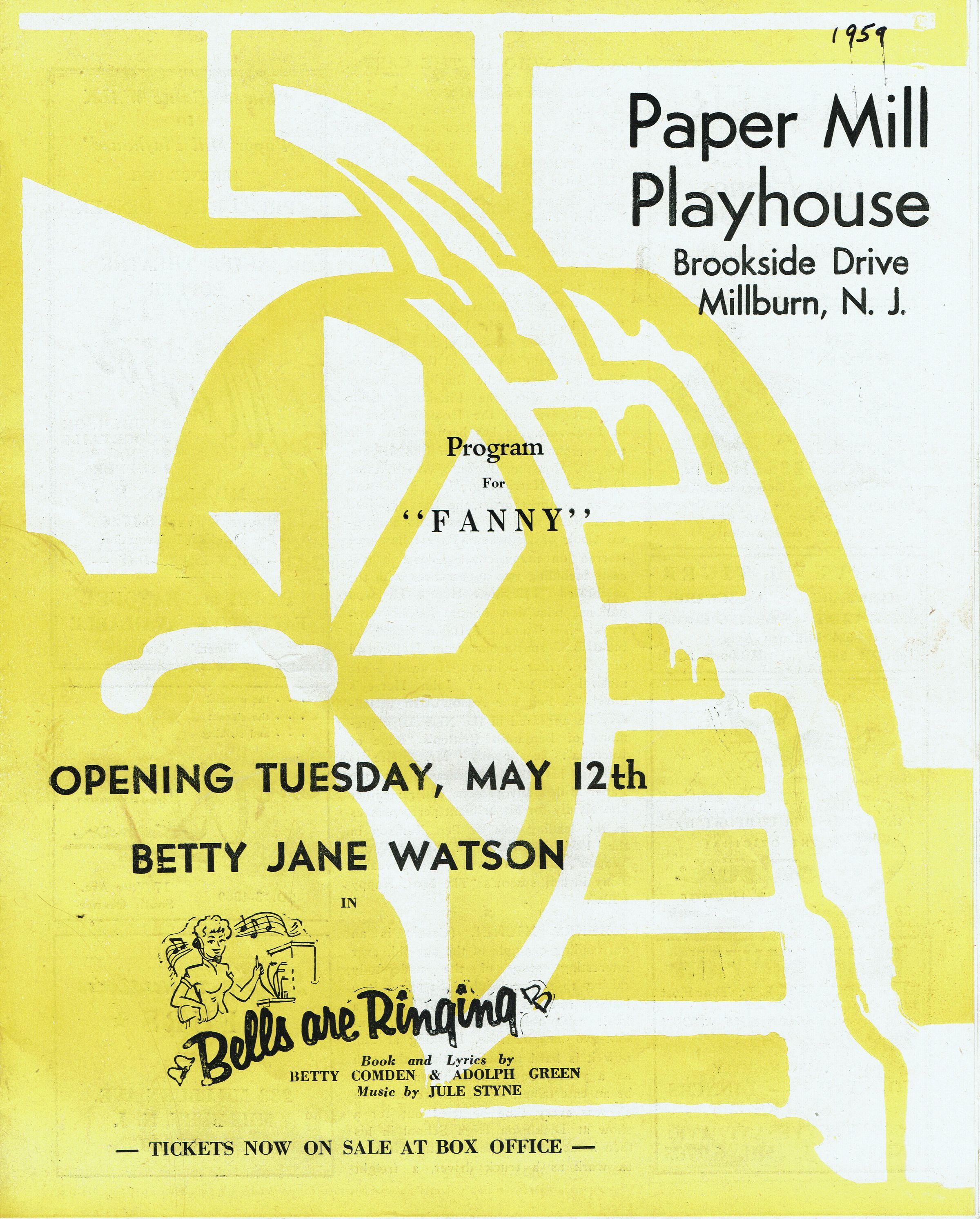 Paper Mill Playhouse Program for Fanny, week starting April 14, 1959 with Edwin Steffe and Henry Michel. 10-page program with cast and production information. Extensively illustrated with B&W area advertisements.Collection