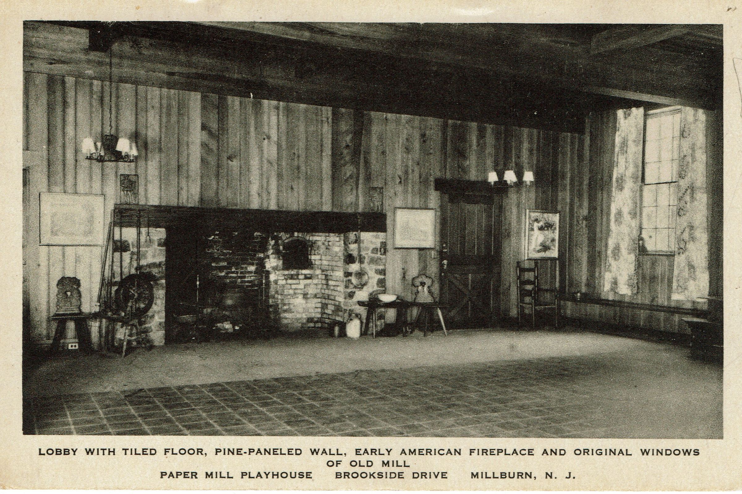 Postally unused photographic postcard of the Lobby of the Paper Mill Playhouse with tiled floor, pine-paneled wall, early American Fireplace and original windows of old mill. Paper Mill Playhouse, Brookside Drive, Millburn, NJ