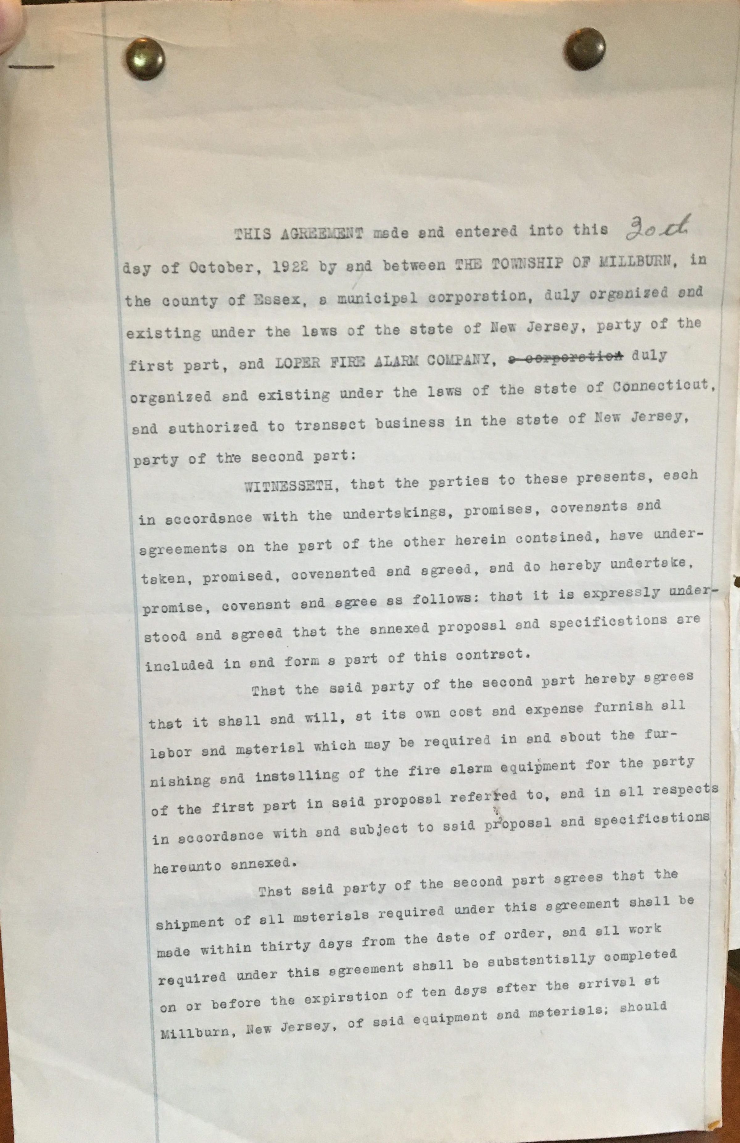 Contract between the Township of Millburn and the Loper Fire Alarm Co. on the installation of fire alarms - October 1922.