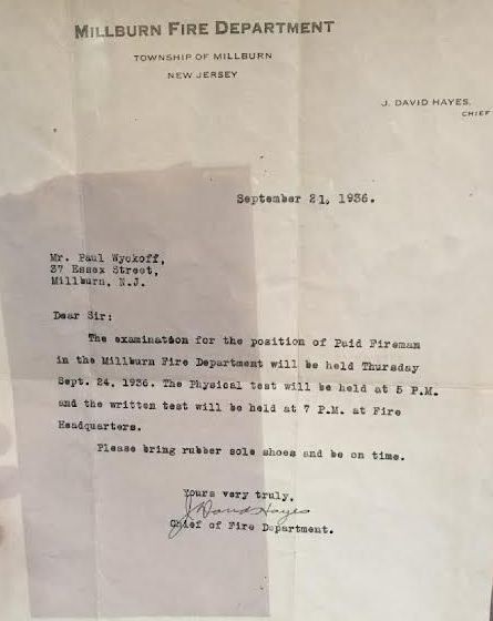Letter to Mr. Paul Wyckoff from the Chief of Fire Dept. (J. David Hayes) on the examination for the position of paid fireman in the Millburn Fire Department dated September 21, 1936.