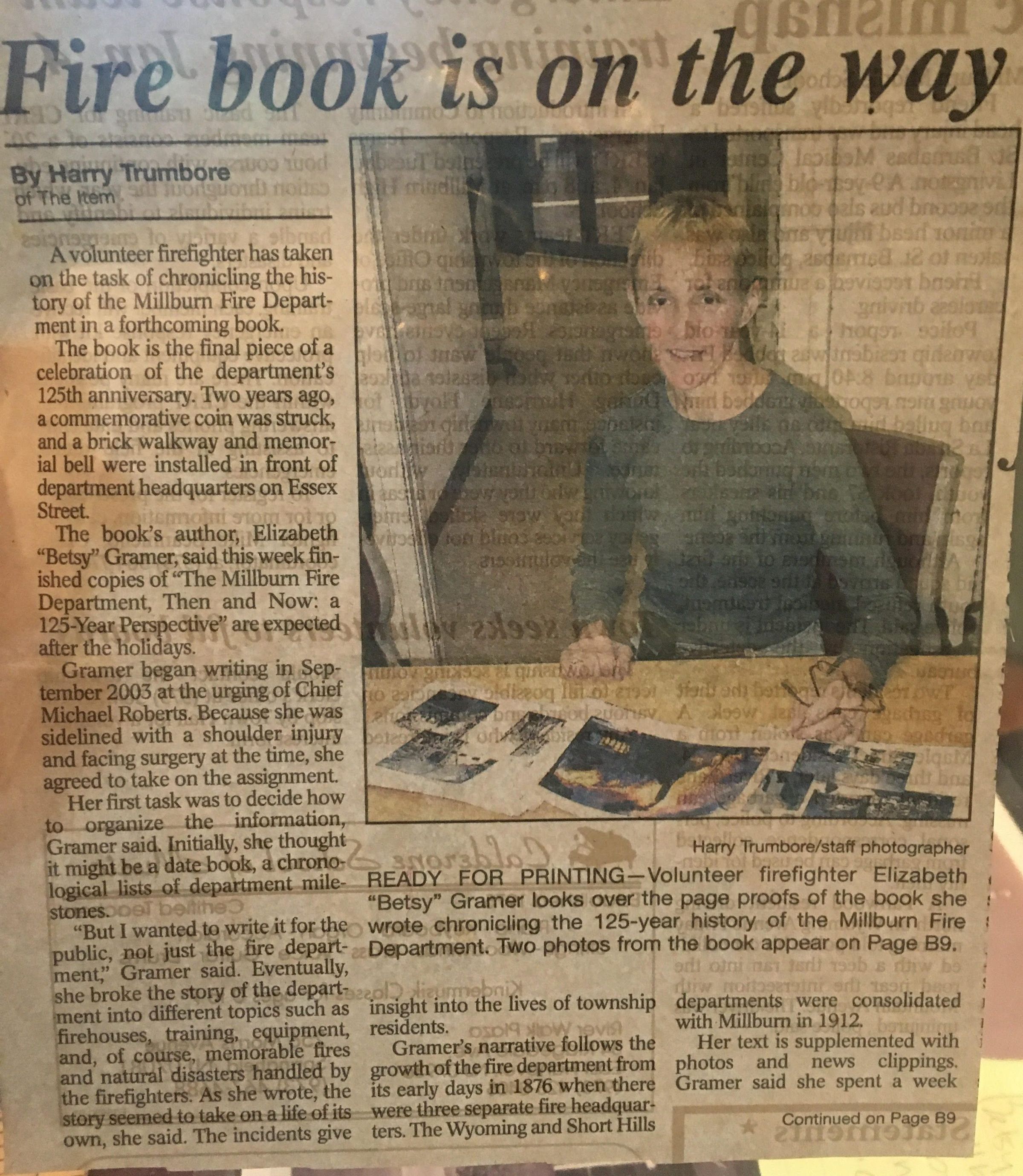 Newspaper clipping of an article in the Millburn Short Hills ITEM, written by Harry Trumbore. The article is about volunteer firefighter Elizabeth "Betsy" Gramer who plans on chronicling the history of the Millburn Fire Dept. in a book as a celebration of the dept.'s 125th anniversary. Her published book is called "Millburn Fire Department - Then and Now - A 125-Year Perspective".