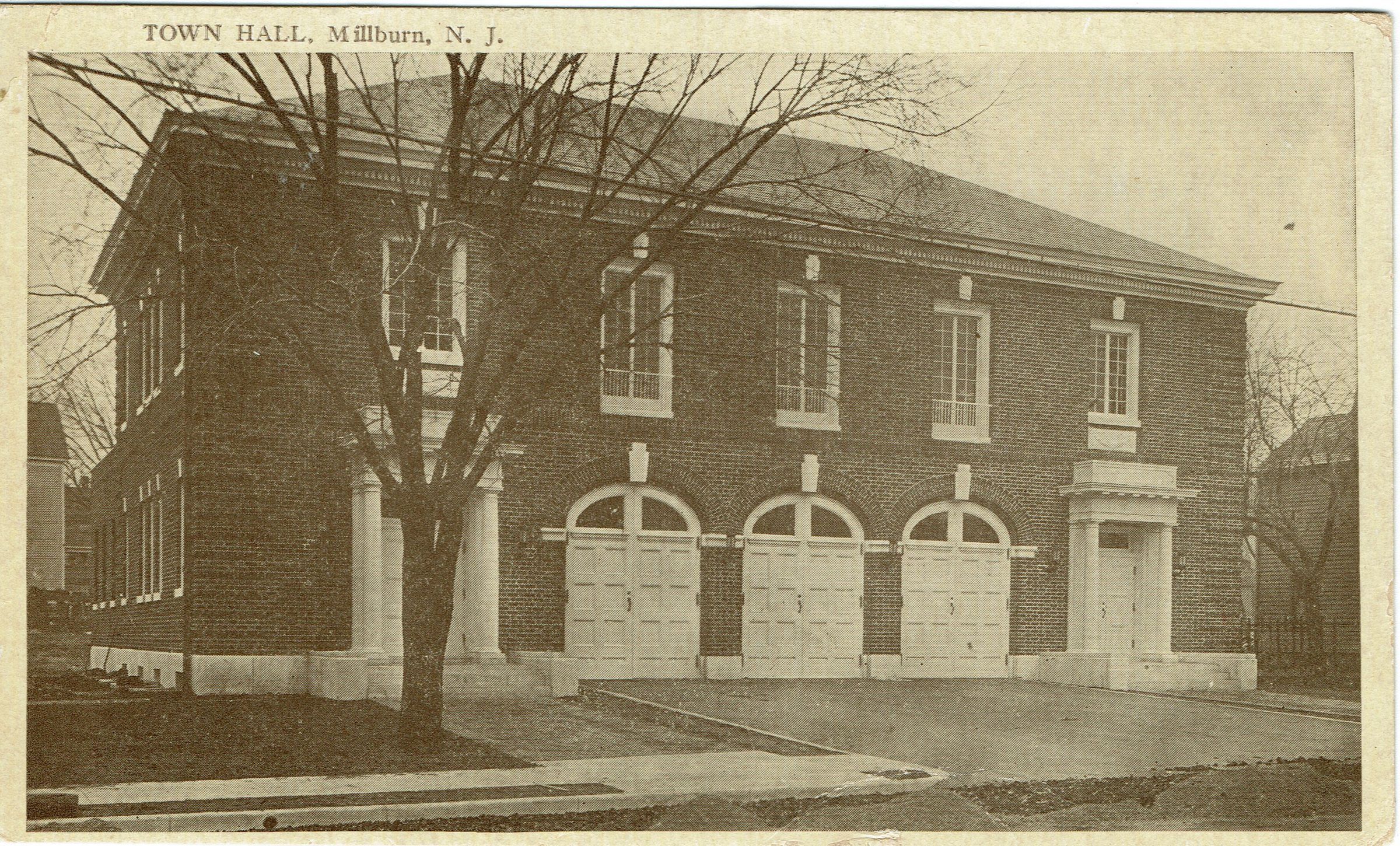 Photographic postcard of the Millburn Fire House, which was also the Town Hall (Municipal Building) showing garage doors closed. Postally unused. Return address sticker on verso is from Mrs. Fred L. Buchholz, 379 Millburn Avenue, Millburn, New Jersey.Collection
