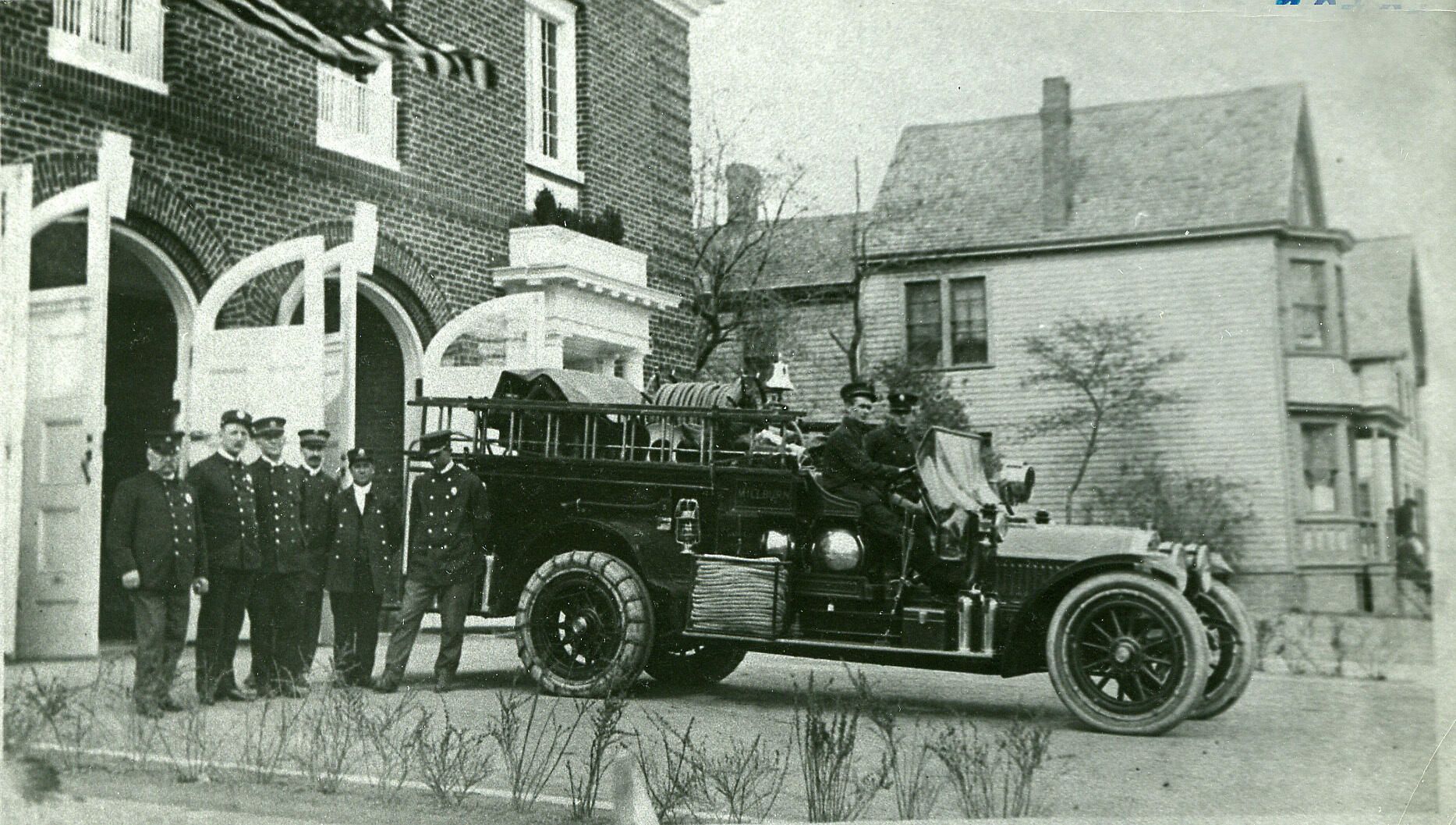 Fire Department: Firemen and Small Ladder Truck at Fire Station/Town Hall