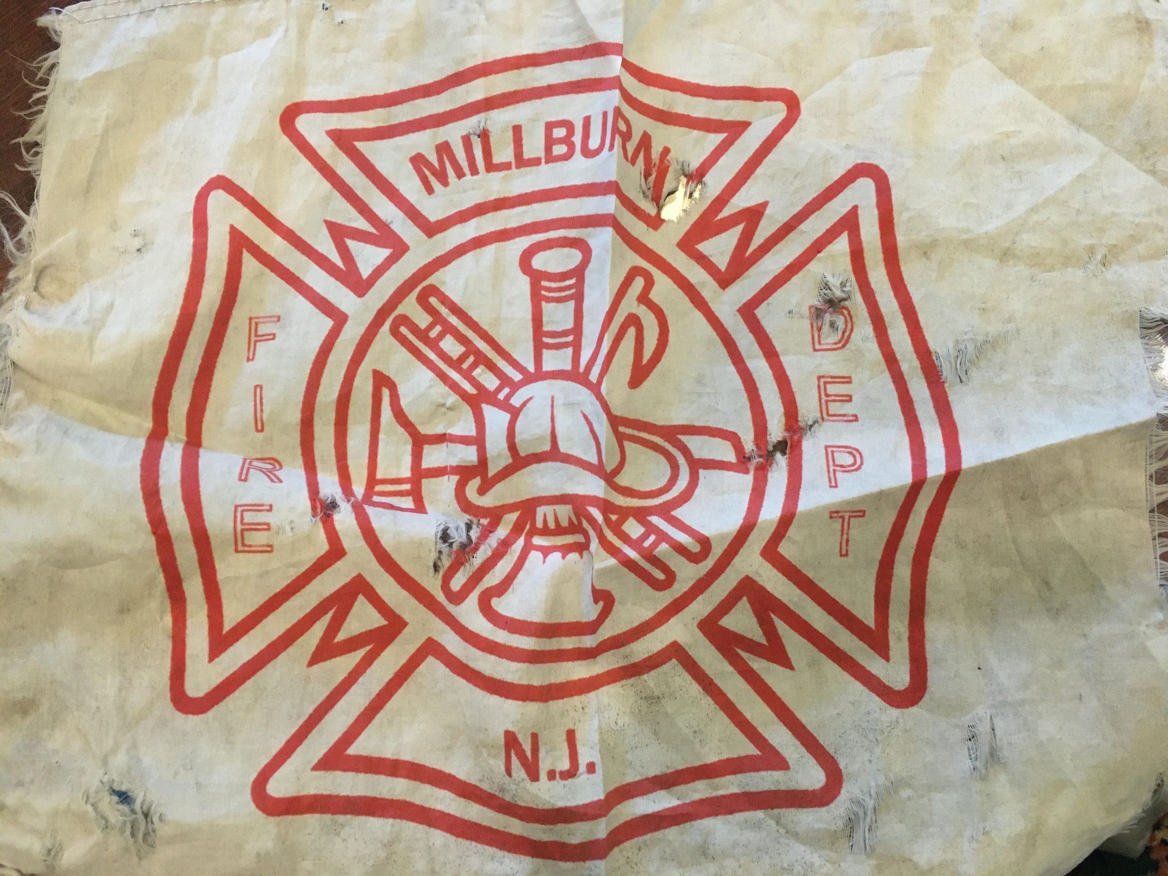 Frayed gray cloth with "Millburn Fire Dept N.J." in red.
