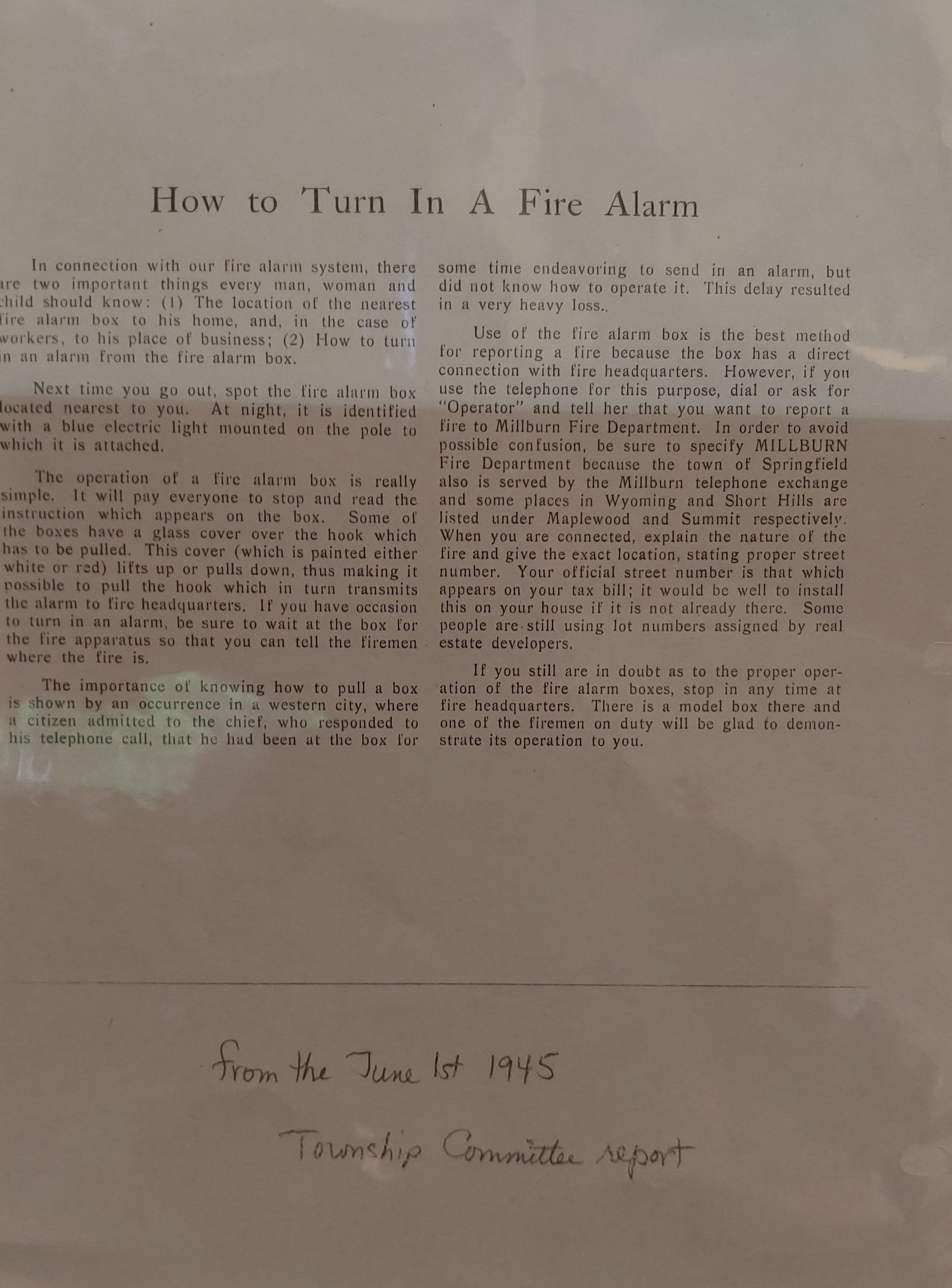 Article from the 1945 Township Committee Report describing the importance of knowing how to Turn In A Fire Alarm and how to do it.