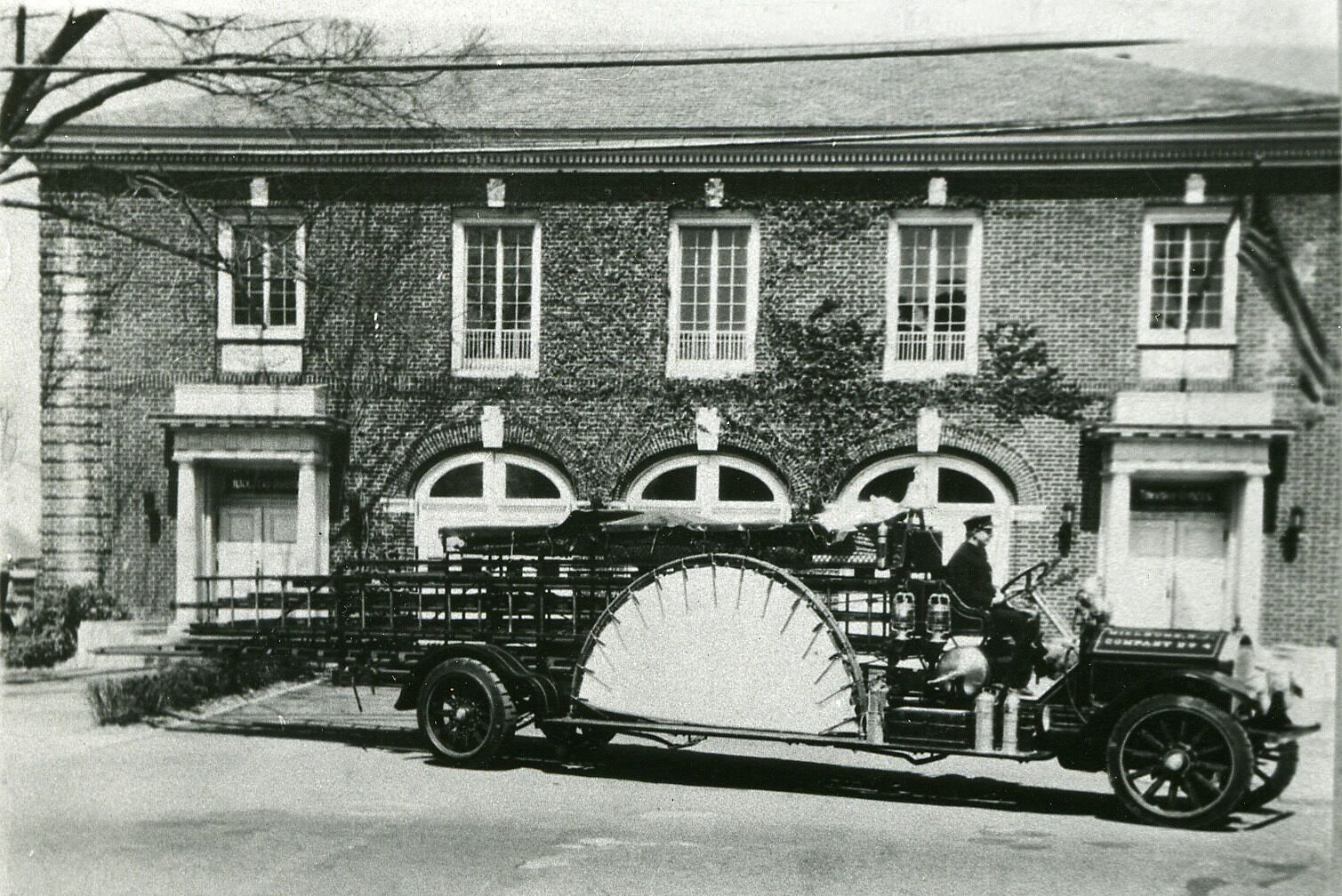 Fire Department: Ladder Truck #4 with Driver in front of Fire Department/Town Hall