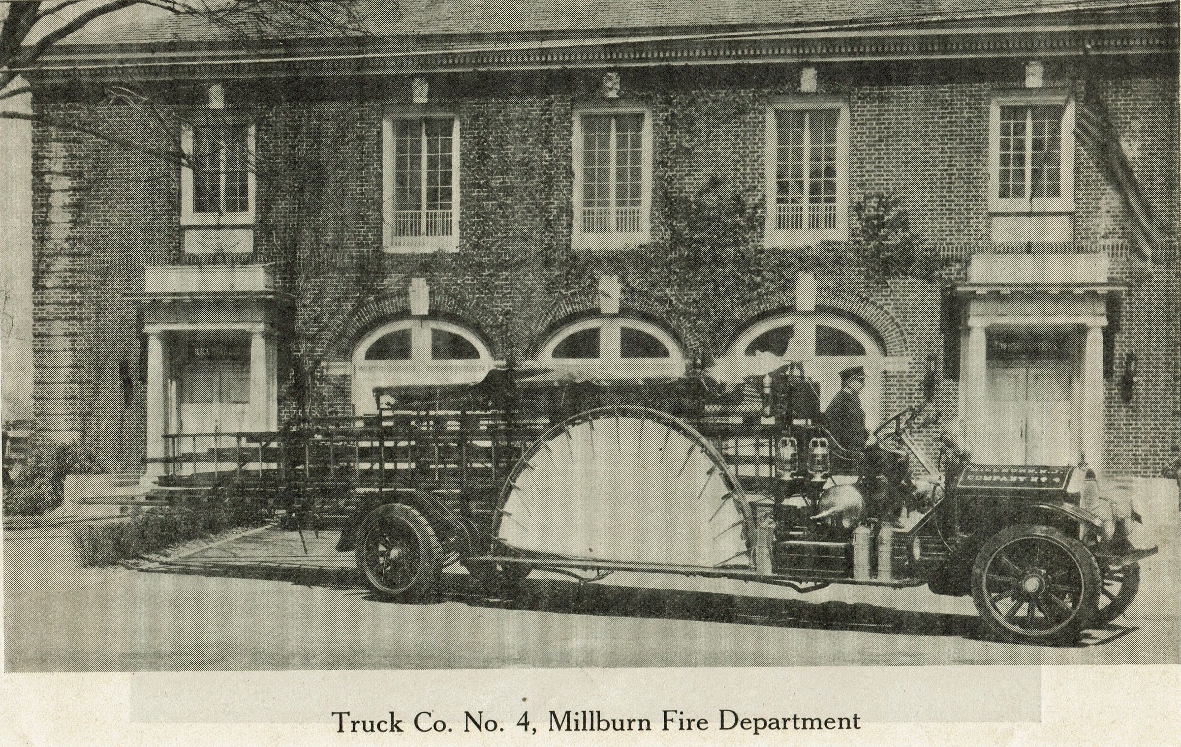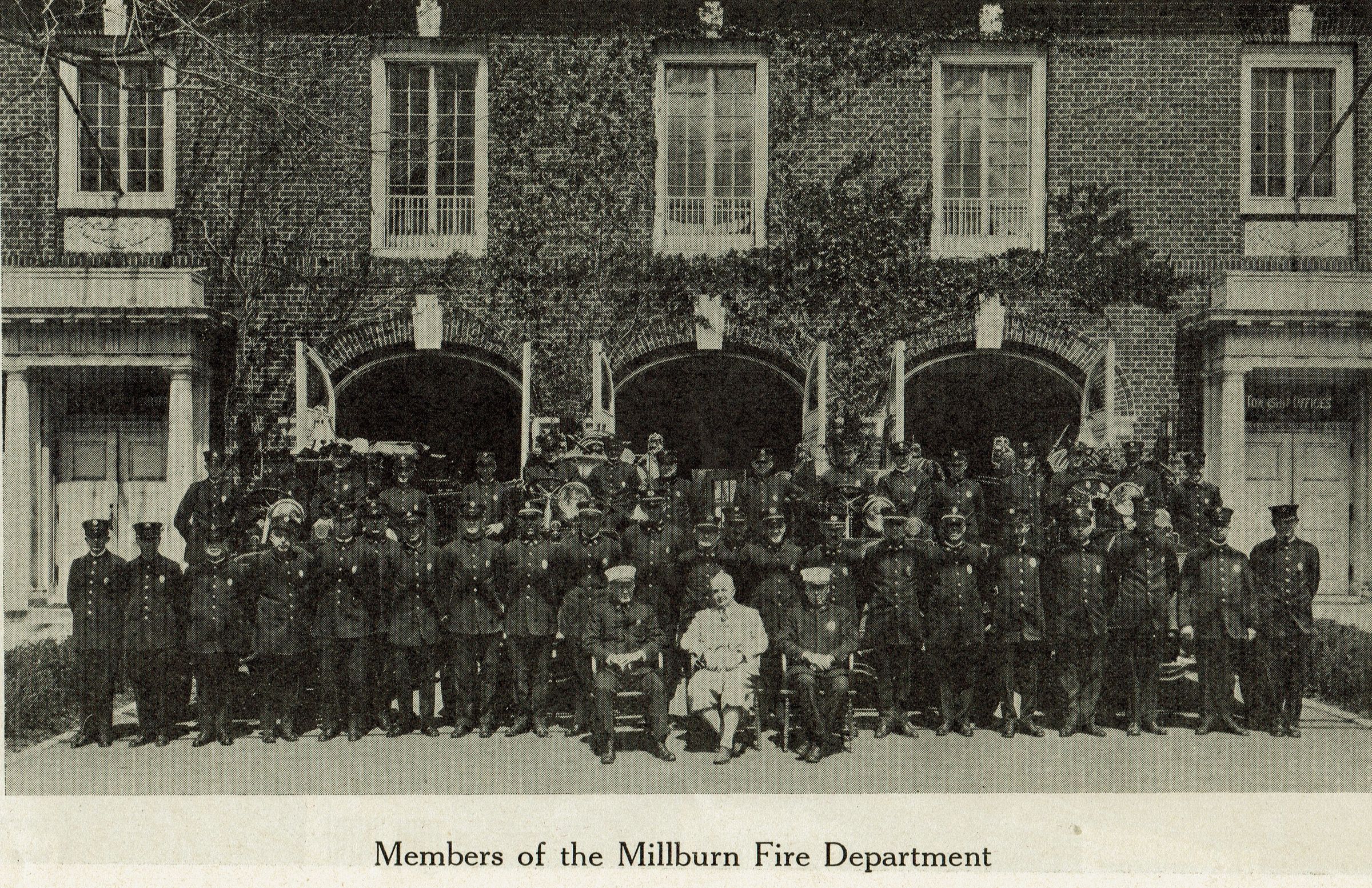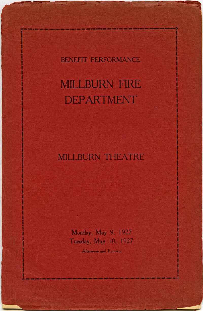1927 Millburn Fire Department benefit performance program at the Millburn Theatre (Theater). Ca. 50-page softcover program with a red cover. The contents of the program include many ads for local and nearby businesses, a history of the MIllburn Fire Department, a list of the fire chiefs, photos of some of the chiefs, photos of fire trucks/apparatus/equipment, fire department headquarters buildings, photos of members of the fire department, photos of interior rooms in the department, etc.