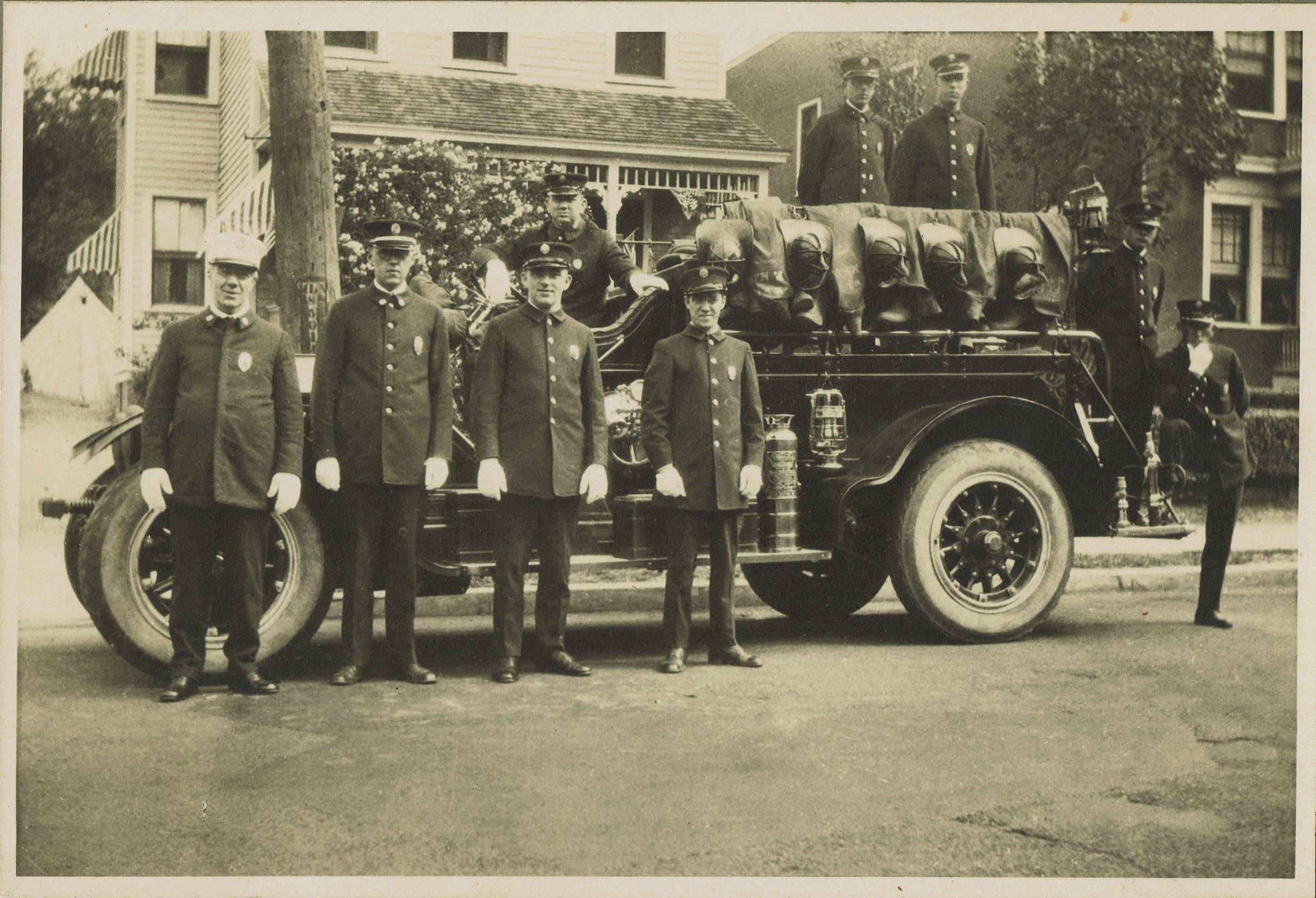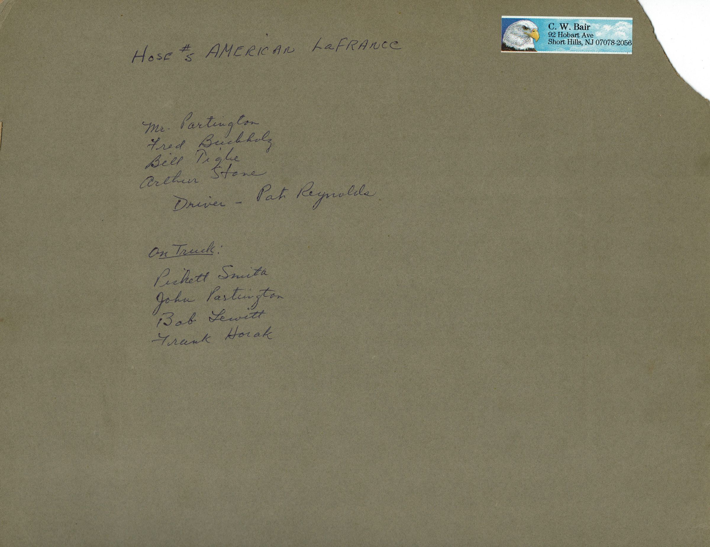 Photograph of the Millburn Fire Department Hose #5, American La France Fire Truck. Verso of photograph contains identifications: Standing: Mr. Partington, Fred Buchholz, Bill Tighe, Arthur Stone, Pat Reynolds (driver). On Truck: Pickett Smith, John Partington, Bob Lewitt, Frank Horak.Dimensions