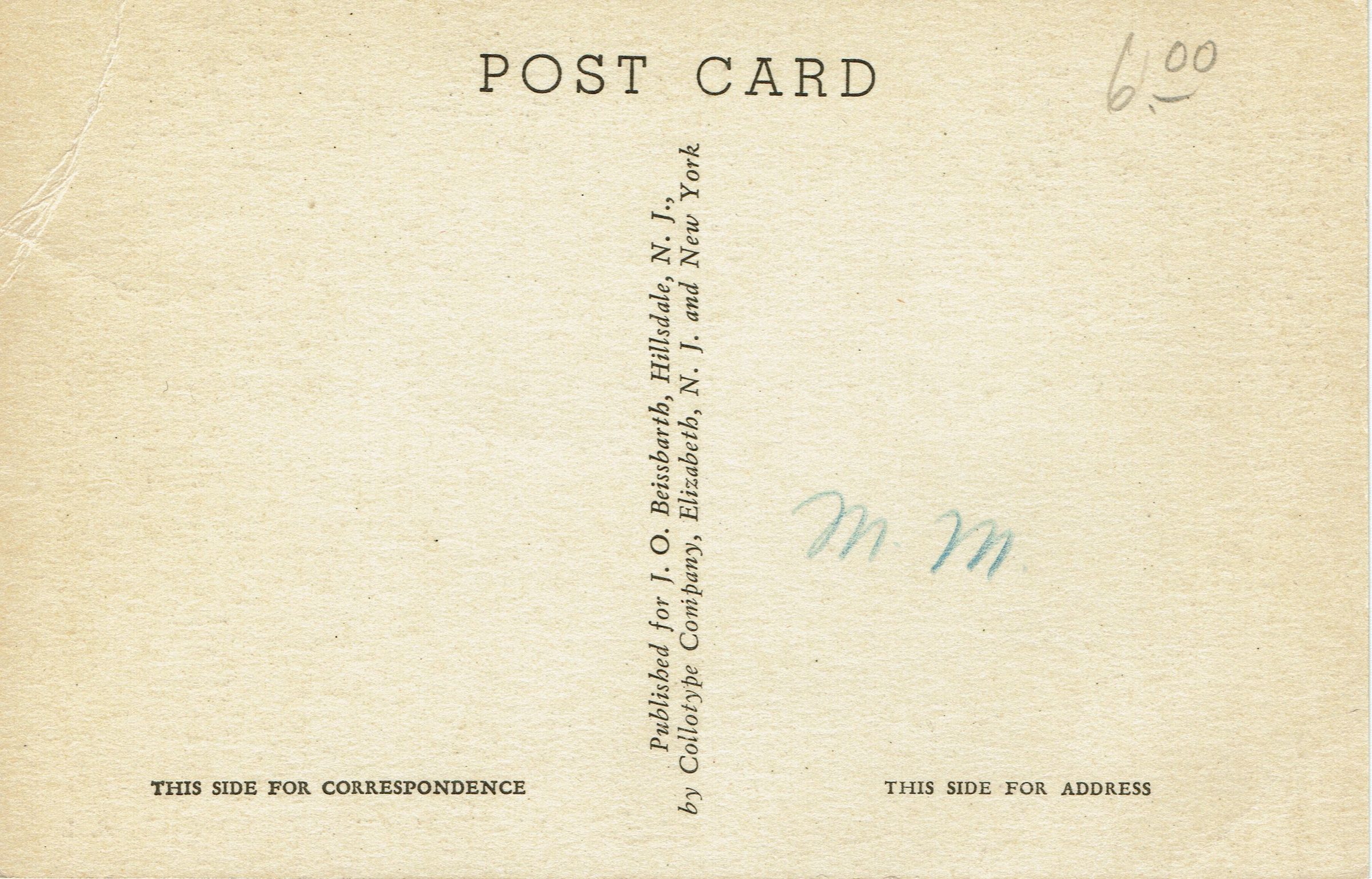 Postally unused. Popular version of image, showing all 3 garage doors open. This version was published for J.O. Beissbarth, Hillsdale, NJ.Collection