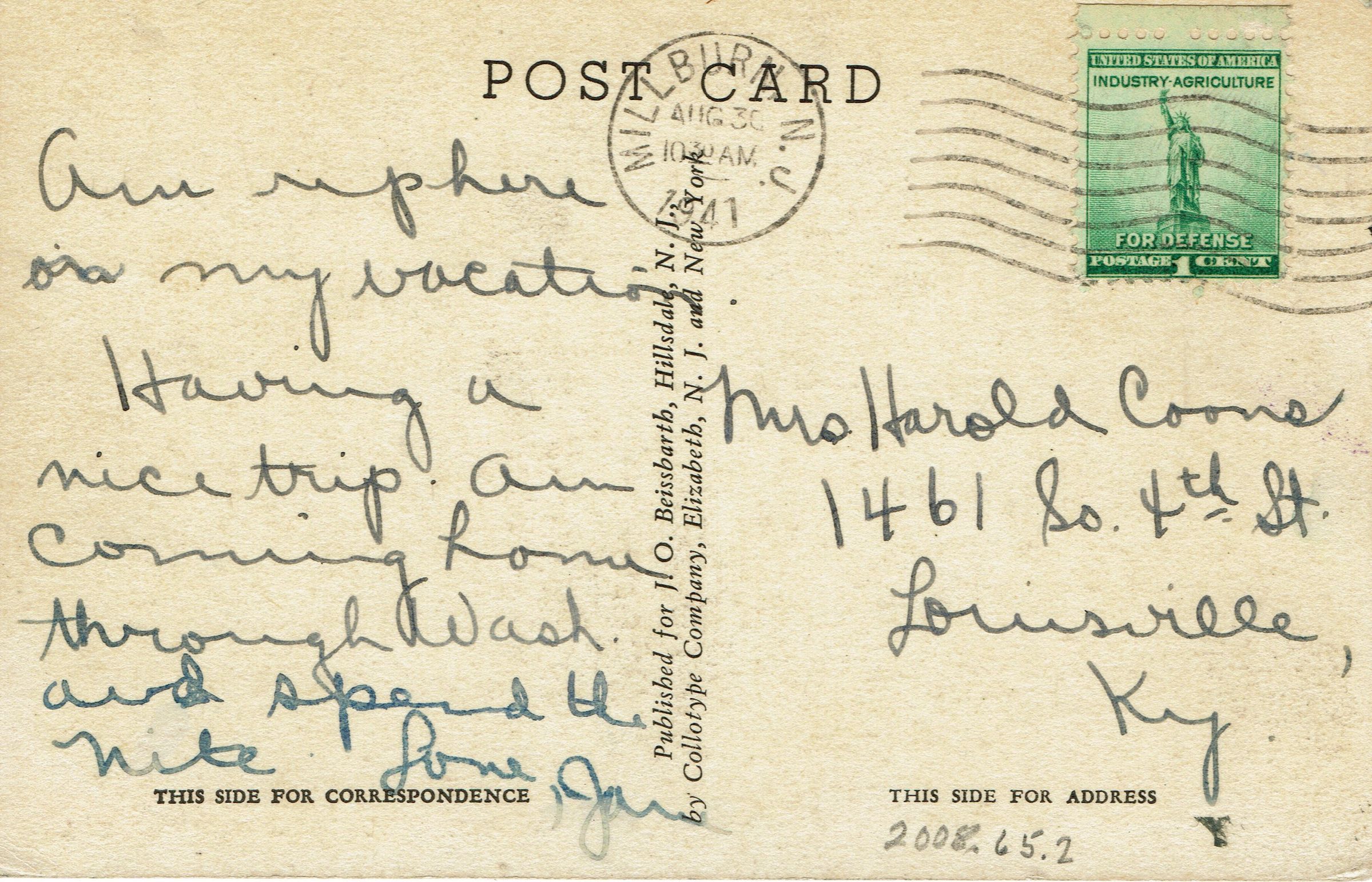 Postally used, postmarked Millburn, August 30, 1941, 10:30 AM. published for J.O. Beissbarth, Hillsdale, NJ. Card is addressed to Mrs. Harold Coons, 1461 South 4th Street, Louisville, Ky.Collection