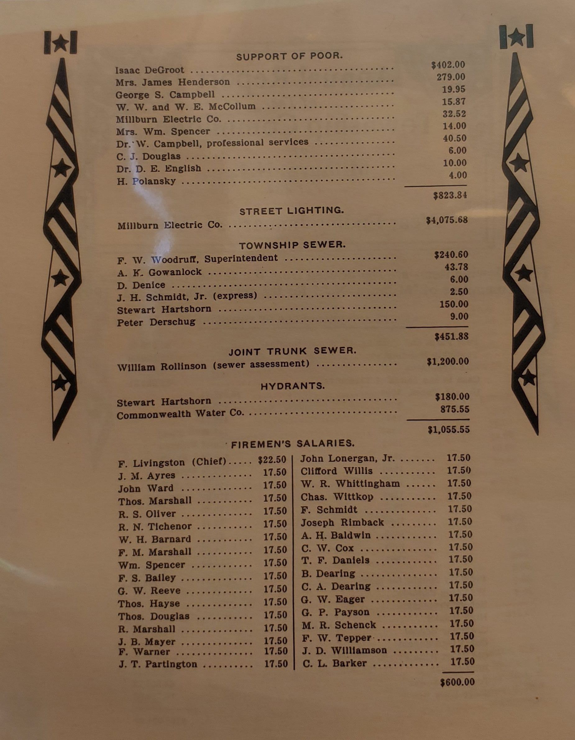 Includes expenses of the whole year such as schools, street lighting, hydrants, and Firemen's Salaries.Dimensions