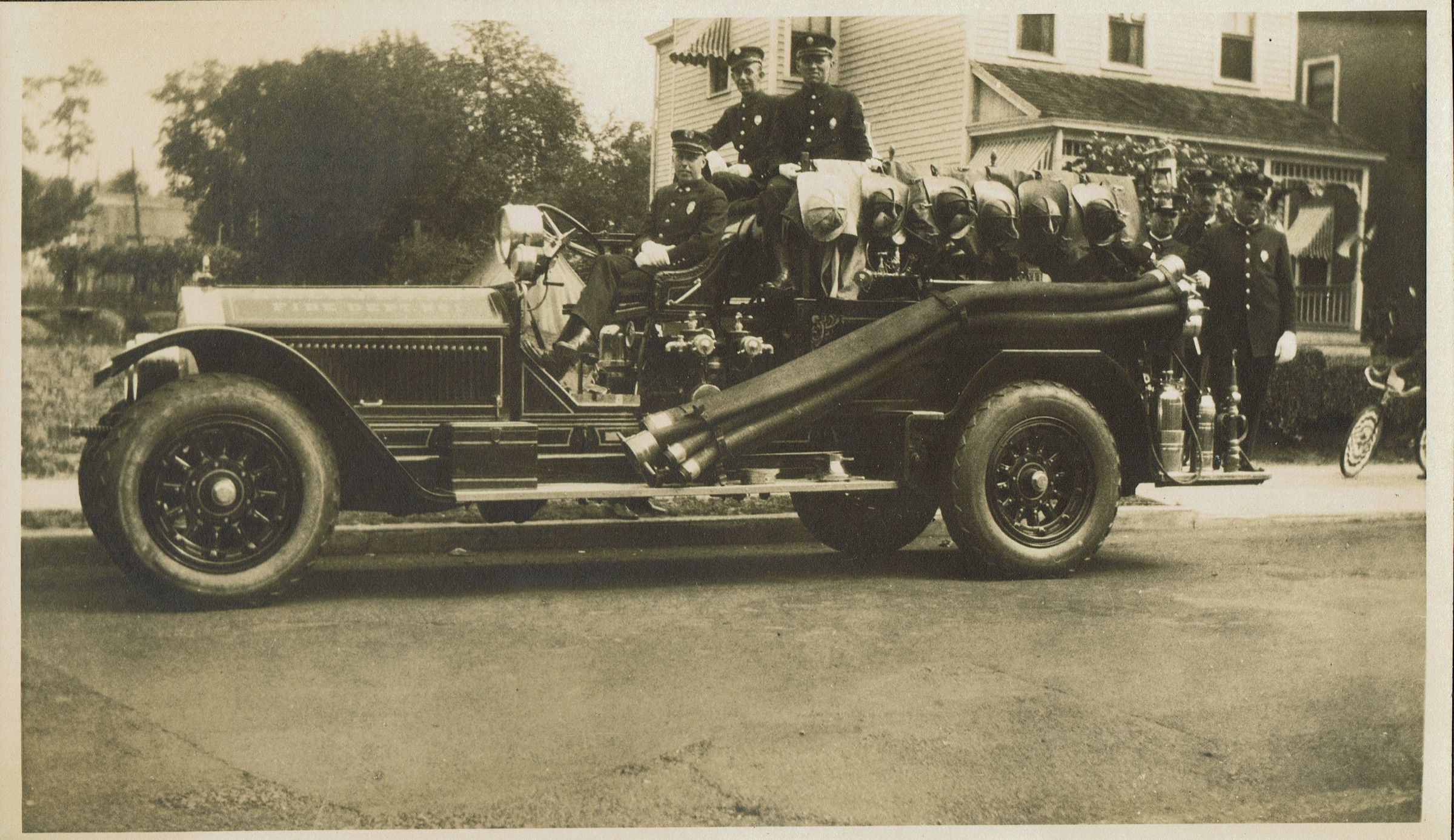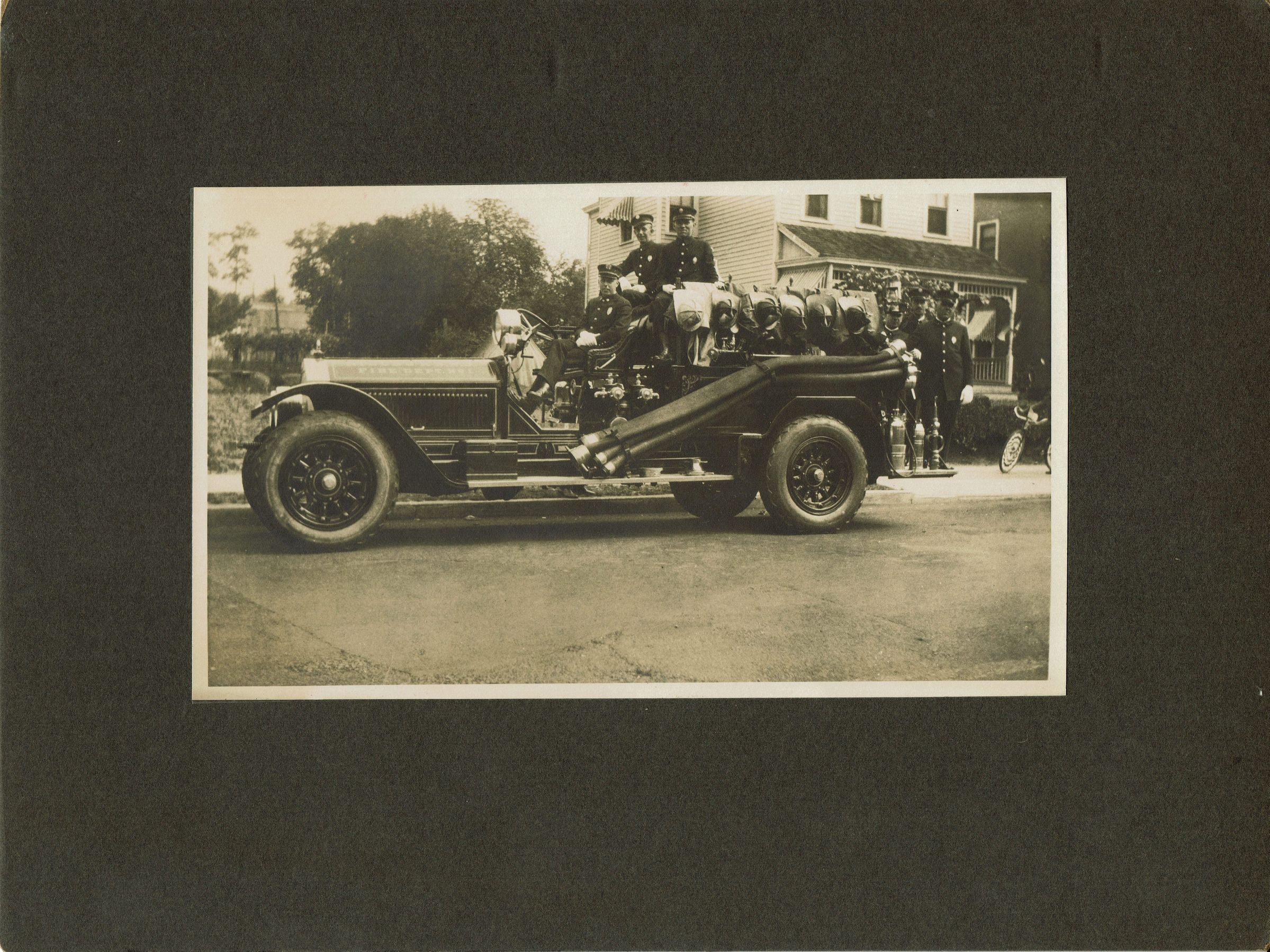 Subject is an early motorized fire truck with firemen on it. Pencil noted on back says "Millburn NJ." When the hood of the truck was digitally distorted and stretched, it more clearly reveals the words "Fire Dept No 1" on the hood. The words above that are less clear, but do seem to say "Millburn N.J." The lower right corner has a bicycle with a front tire that seems to be decorated for a parade. Records indicate that the first motorized fire truck was purchased for the Millburn Fire Department in 1912. The truck and the uniforms seem to point to some time period between then and 1930.