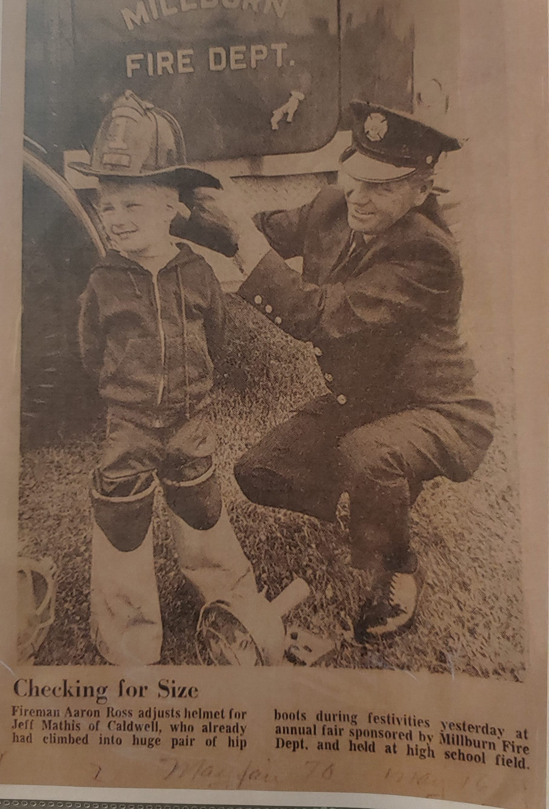 Fire Department: Photo of Fireman Aaron Ross adjusting helmet for Jeff Maths at Fire Department Annual Fair.Entry/Object ID