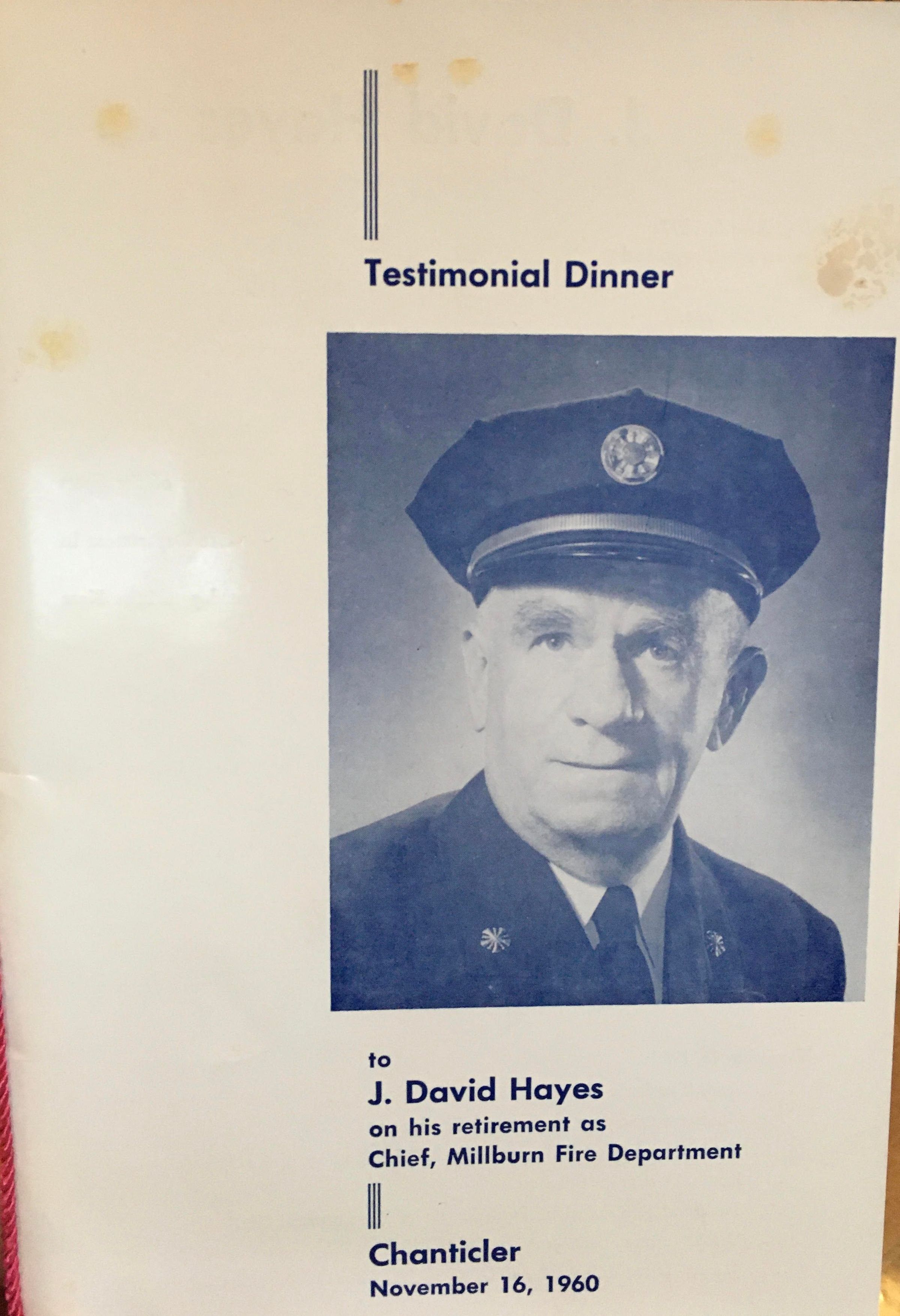 Testimonial dinner program for J. David Hayes on his retirement as chief of the Millburn Fire Department. Took place on November 16, 1960.