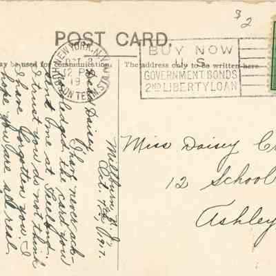 Postally used photographic postcard of the First Baptist Church, Millburn Avenue postmarked New York, October 8, 1917 and addressed to Miss Daisy Craig, 12 School Lane, Ashley, Pennsylvania. The message reads: Millburn, NJ, October 17, 1917. Dear Daisy, I have never acknowledged the card you sent me at Freeland. I trust you do not think I have forgotten you. I hope you are all real well. We are having beautiful weather. Makes everyone feel good. Lovingly your, Flossy Douglas.Collection