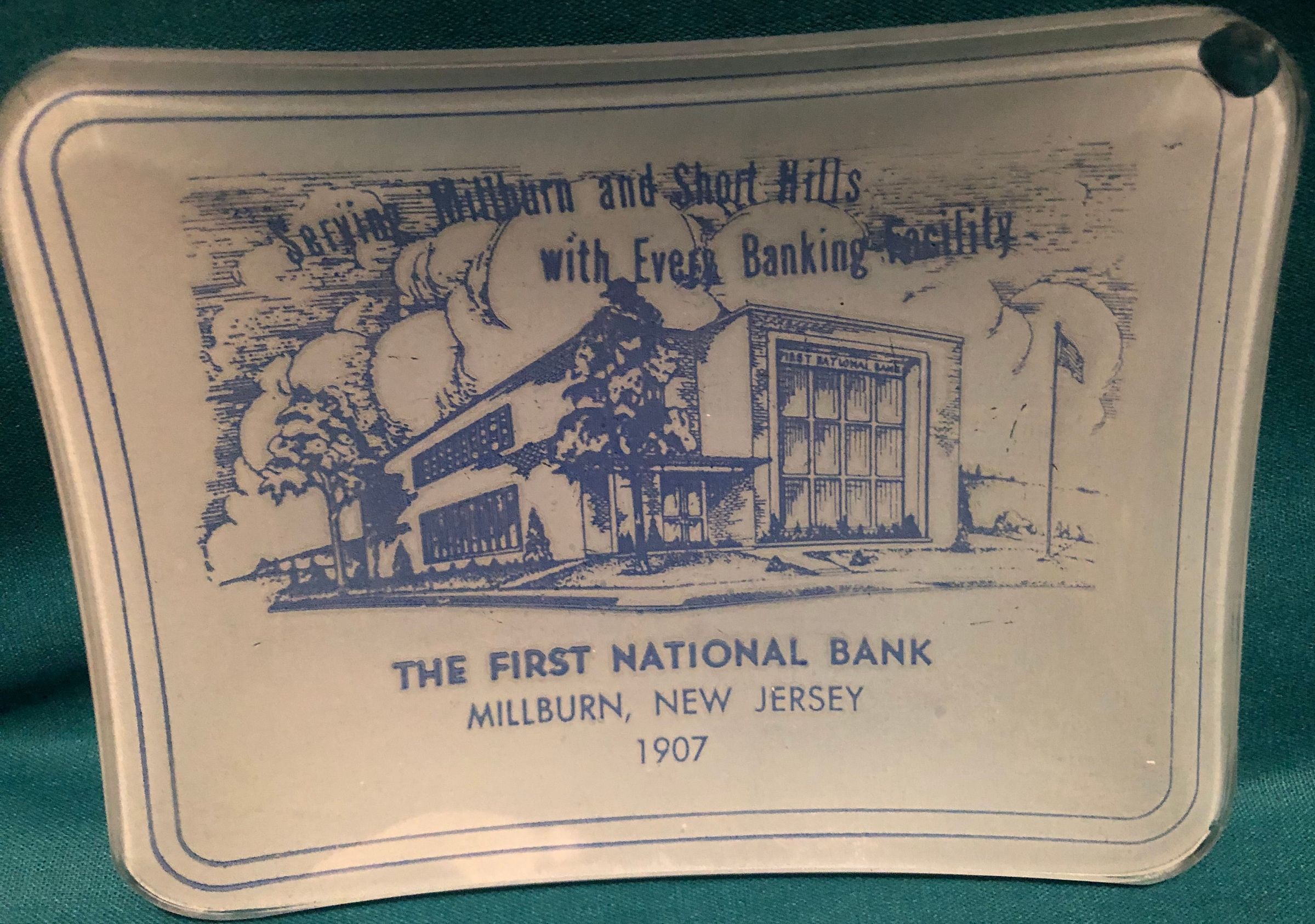 Two shallow glass promotional dishes from The First National Bank, Millburn. Image of the building in blue and red.Acquisition
