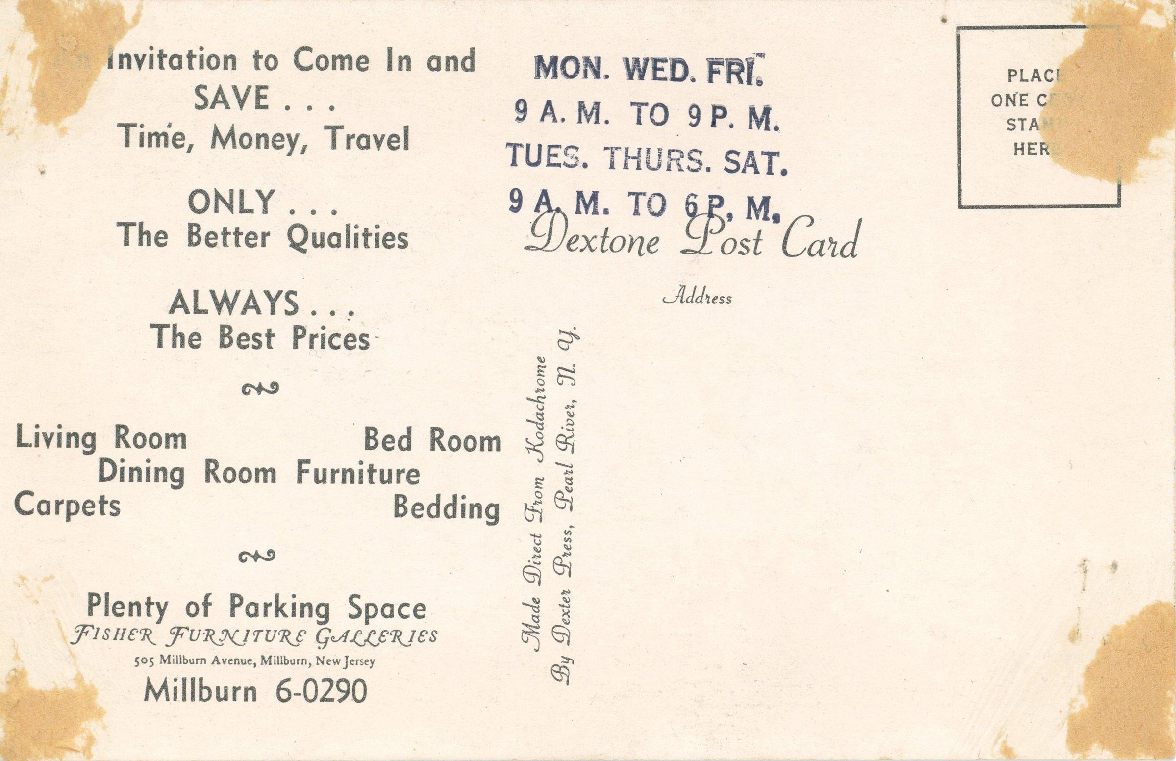 Advertising postcard for Fisher Furniture Galleries, 505 Millburn Avenue, Millburn New Jersey. Fisher Furniture was established in 1940 by Edwin George Fisher (49 Nottingham Road) and remained in business until 1960.Acquisition
