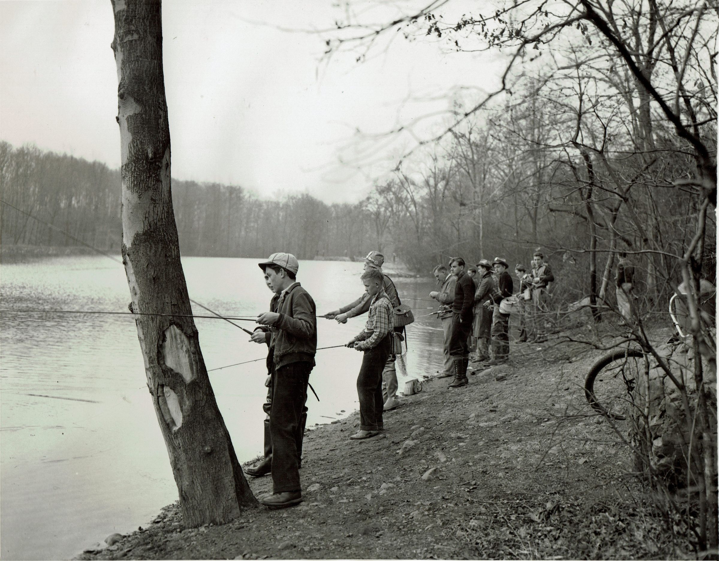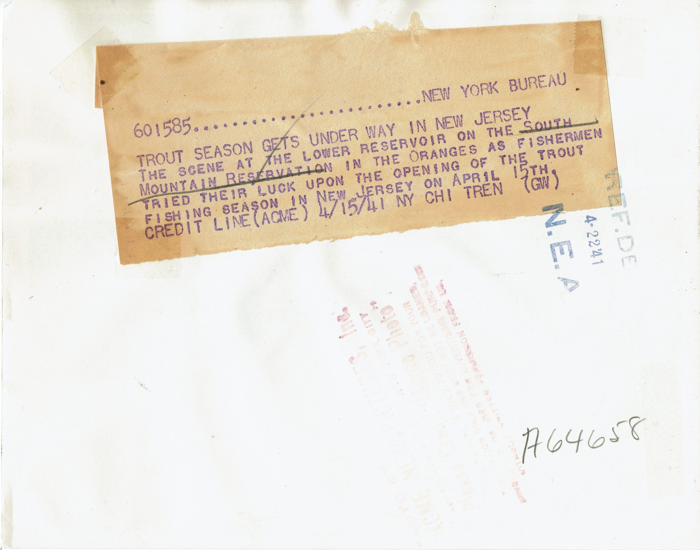 Acme Newspictures, Inc. photograph of opening day of Trout Fishing Season, April15, 1941. Caption on verso of photograph reads: "Trout Season gets under way in New Jersey." The scene at the lower reservoir on the South Mountain Reservation in the Oranges as Fishermen tried their luck upon the opening of the trout fishing season in New Jersey on April 15th.Acquisition