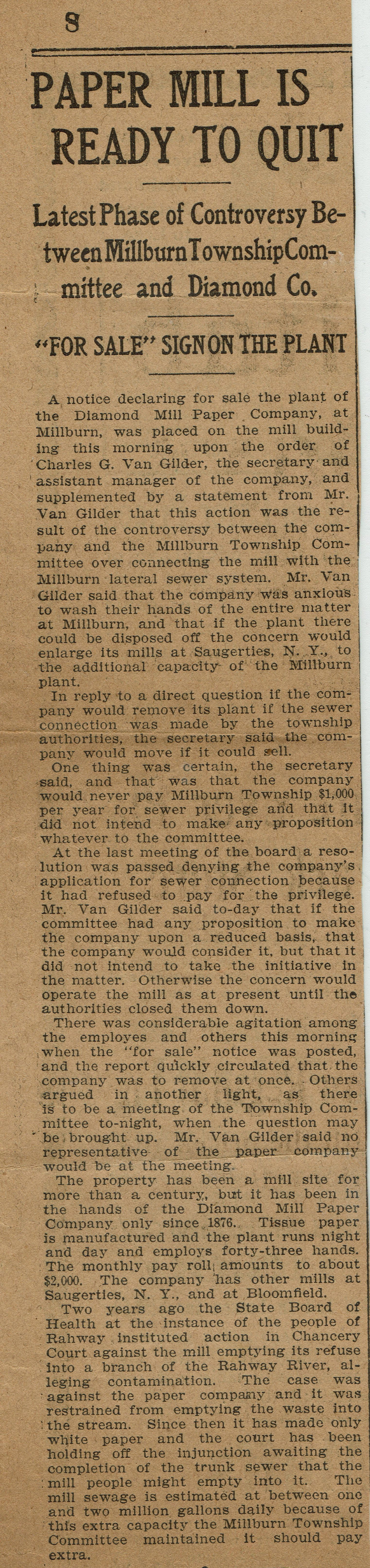 Flanagan: Diamond Paper Mill Ready to Quit, 1904