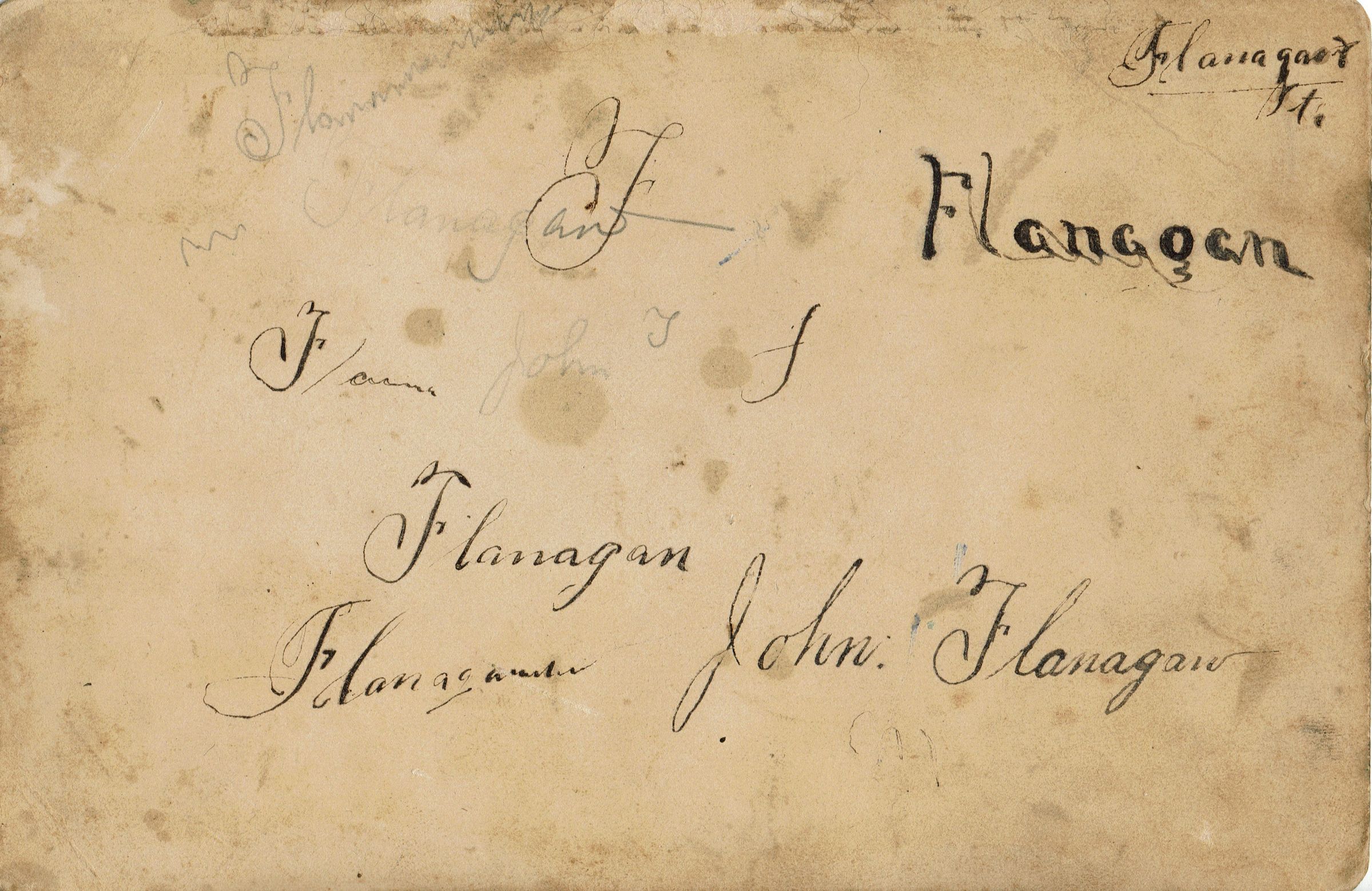 Black and White Photograph of 6 men standing in front of Dwyer's Plumbing, Tin & Sheet Iron Work Shop, one of whom may be John Flanagan. There was a plumber named John Dwyer, who had a shop in Newark in 1891. Verso of photograph has John Flanagan written several times.Photograph Details