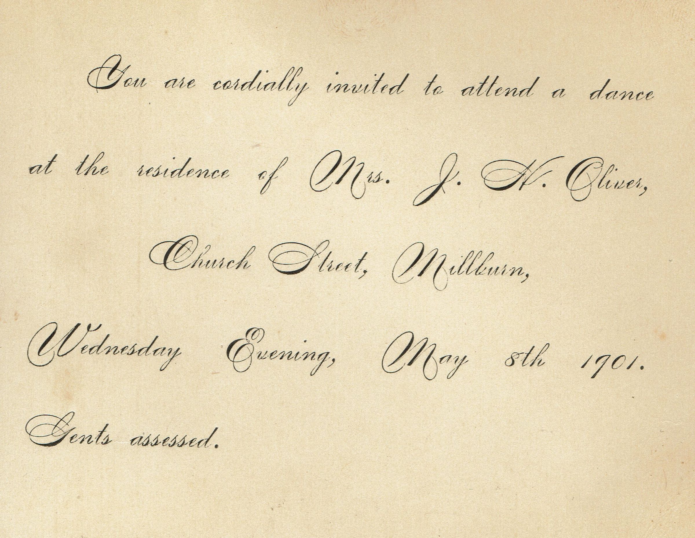 Invitation to attend a dance at the residence of Mrs. J.H. Oliver, Church Street, Millburn on Wednesday evening, May 8, 1901.Collection