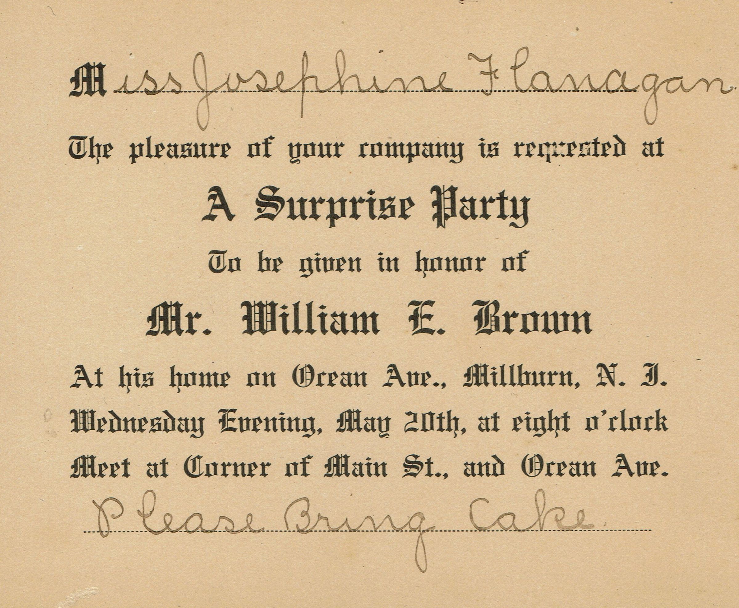 Invitation to Miss Josephine Flanagan to a surprise party given in honor of Mr. William E. Brown at his house on Ocean Avenue in Millburn on Wednesday, May 20 (1903) at 8:00 pm. Instructions are to meet at the corner of Main Street and Ocean Avenue and to "please bring cake."Collection
