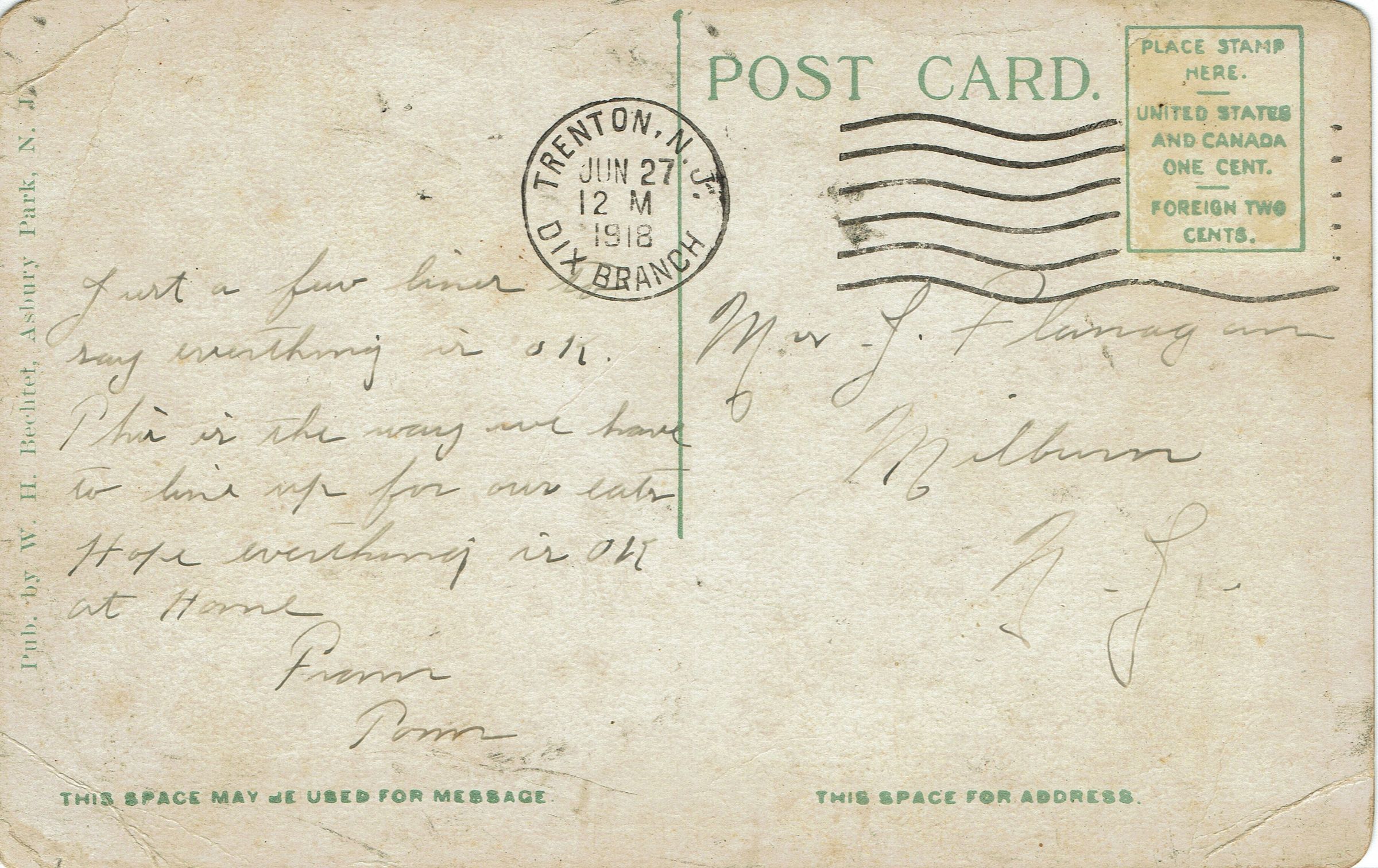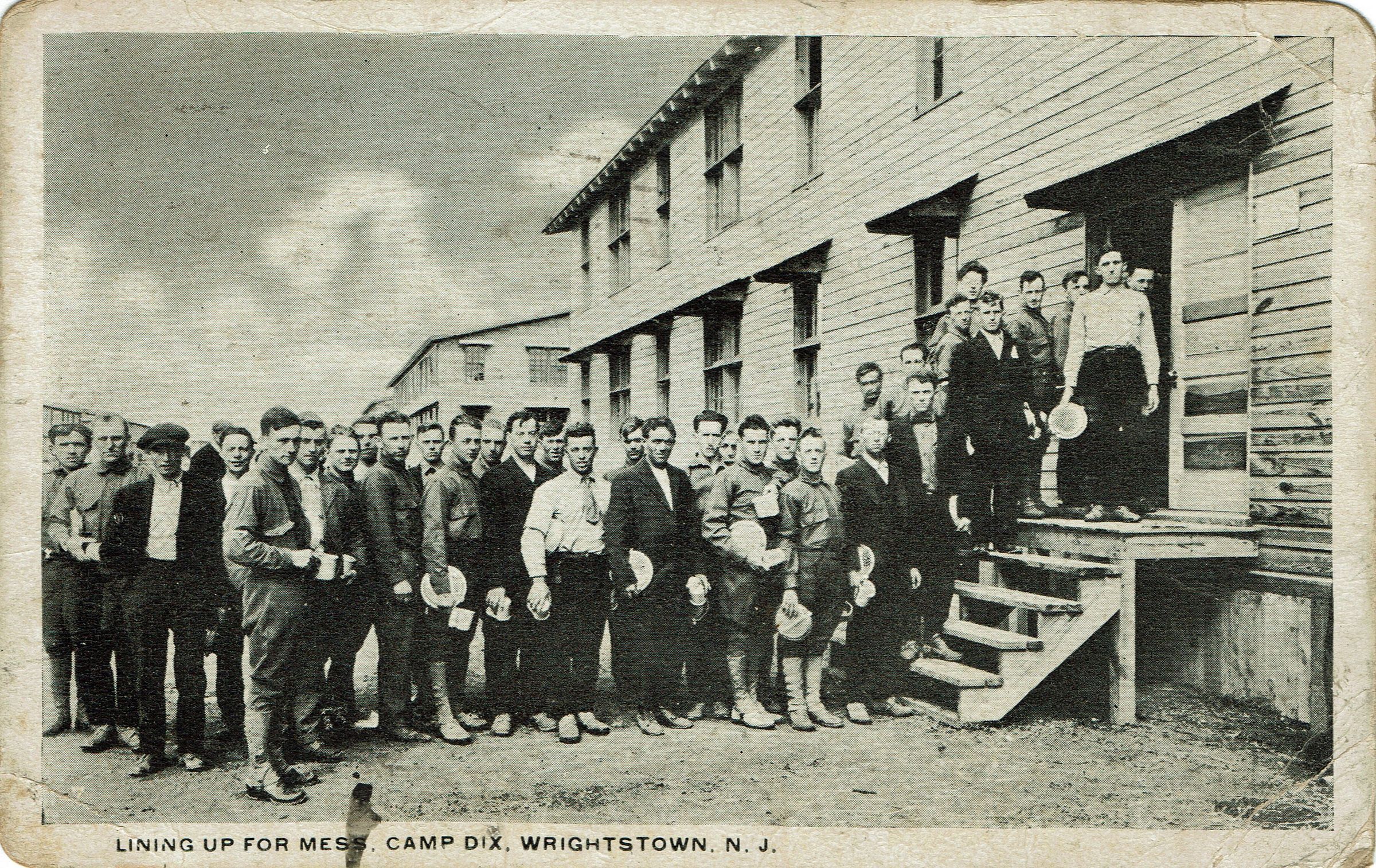 Postally used photographic postcard of Lining Up for Mess, Camp Dix, Wrightstown, New Jersey, from Thomas Flanagan to Miss J. Flanagan, Millburn, New Jersey. Postmarked Trenton, N.J., Dix Branch, July 27, 1918, 12:00 M.