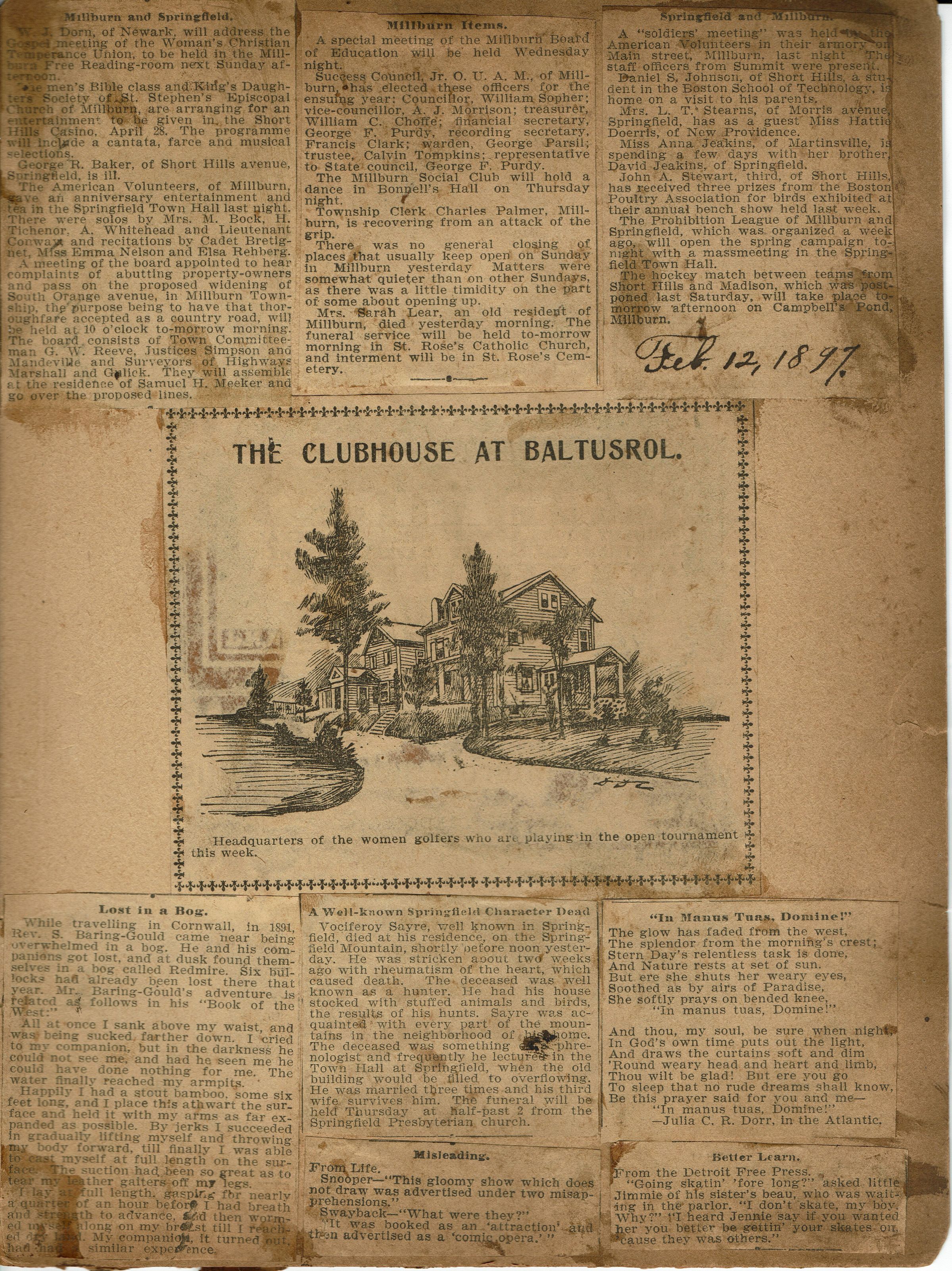 Newspaper clippings from page 1 of the scrapbook belonging to the Flanagan family (44 Mechanic Street, Millburn). Topics covered in the articles include: Musical entertainment at the Short Hills Casino, widening of South Orange Avenue in Millburn Township, Officers of the Success Council Jr. O.U.A.M. of Millburn (William Sopher, A.J. Morrison, William C. Choffe, George F. Purdy, Francis Clark, George Parsil, Calvin Tompkins),Prohibition Leagues of Millburn and Springfield organized a week ago (February 12, 1897), Clubhouse at Baltusrol.Collection