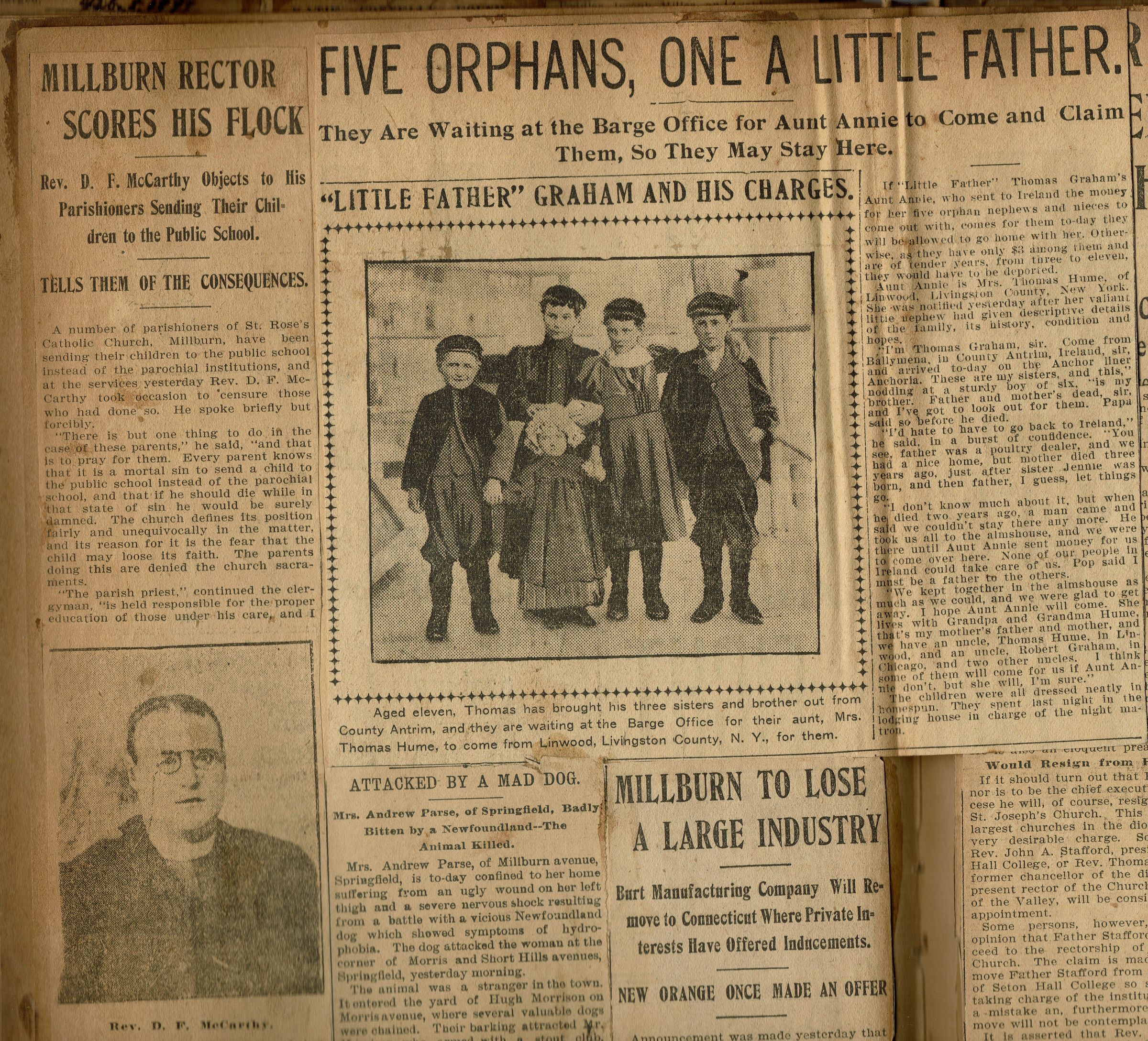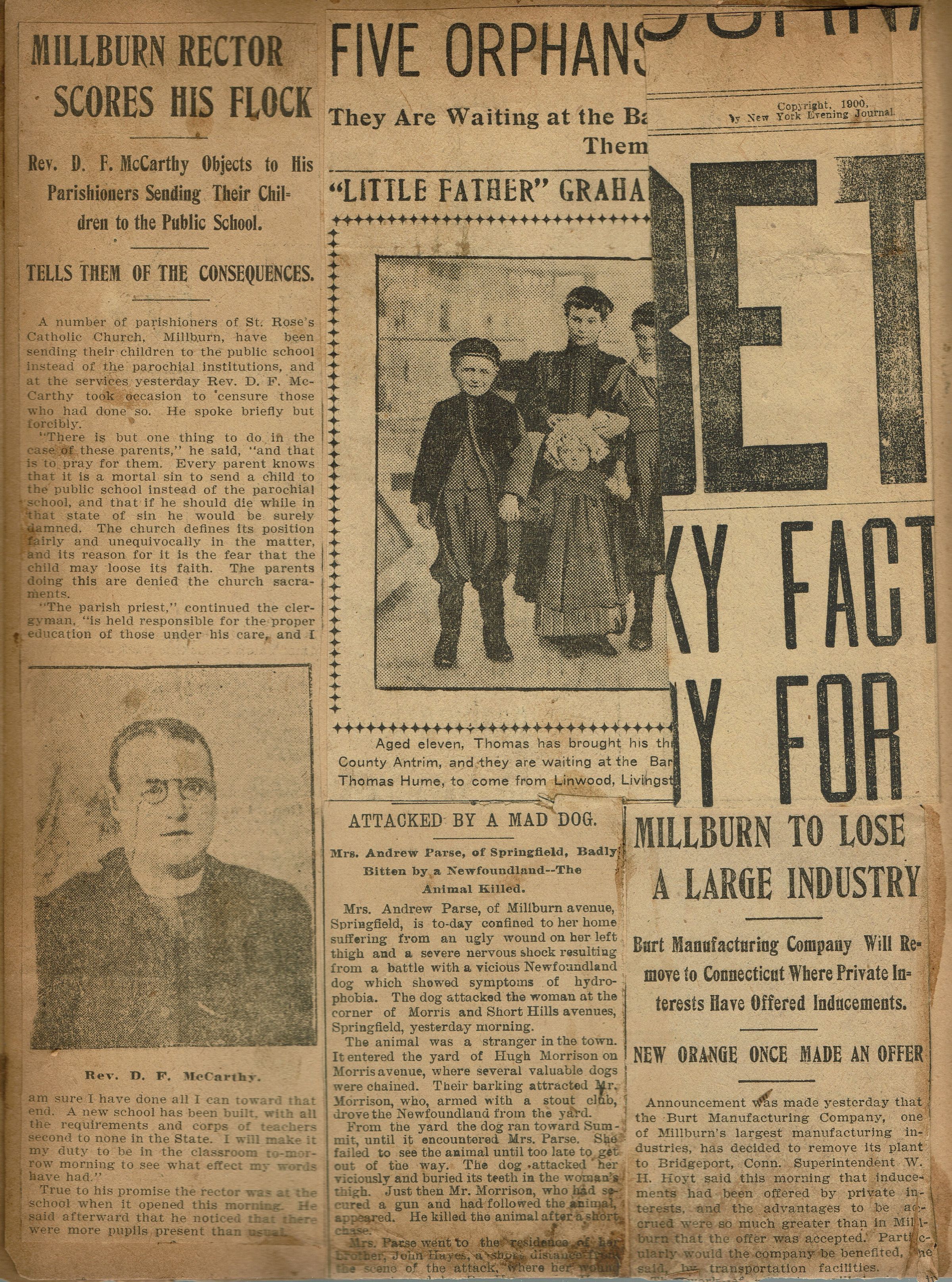Newspaper clippings from page 13 of the scrapbook belonging to the Flanagan family (44 Mechanic Street, Millburn). Topics include the departure of the Burt Manufacturing Company from Millburn (June, 26, 1902, Newark Evening News).Collection