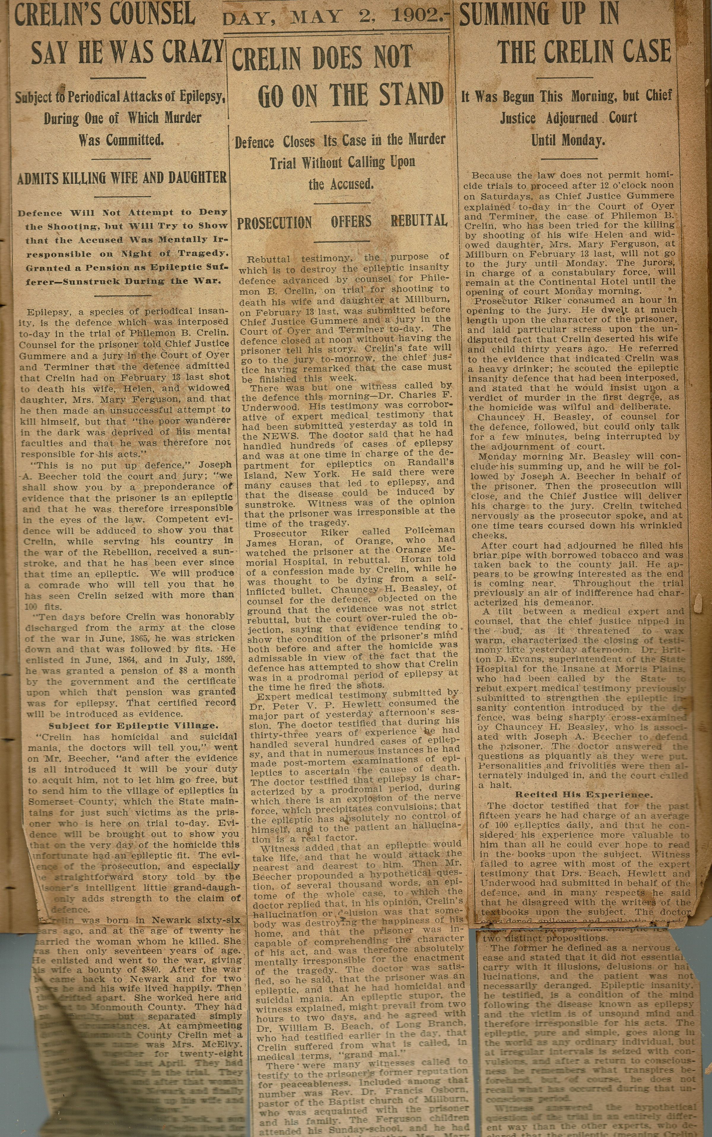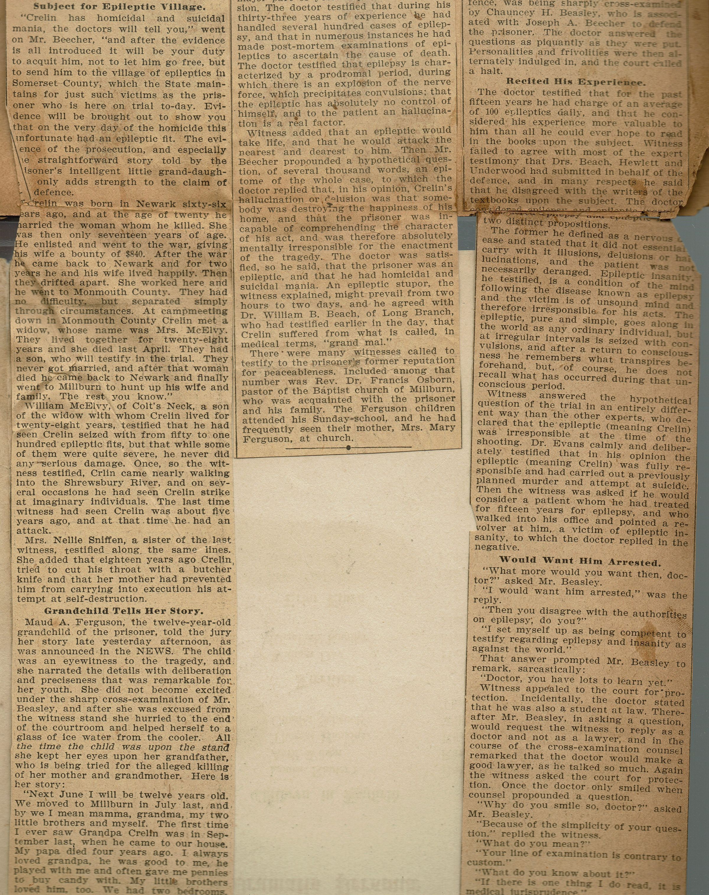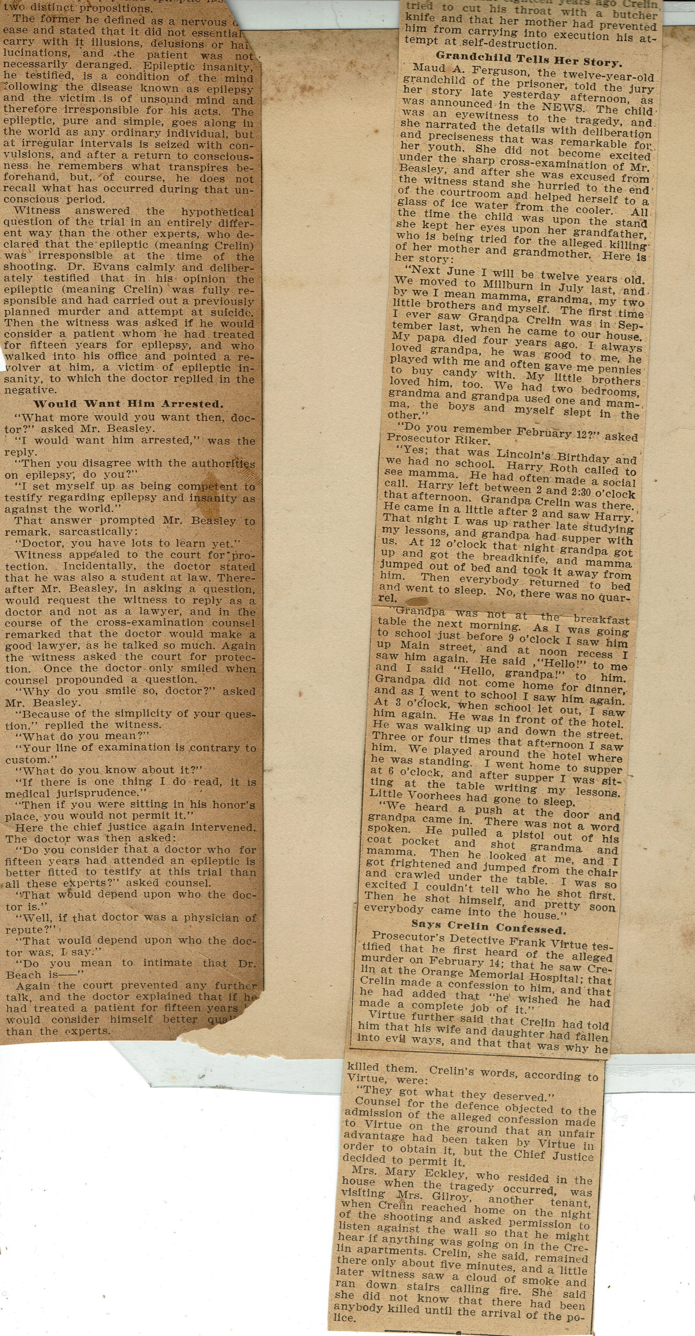 Newspaper clippings from page 29 of the scrapbook belonging to the Flanagan family (44 Mechanic Street, Millburn) from May 1902 relating to the Crelin Murder trial.Collection