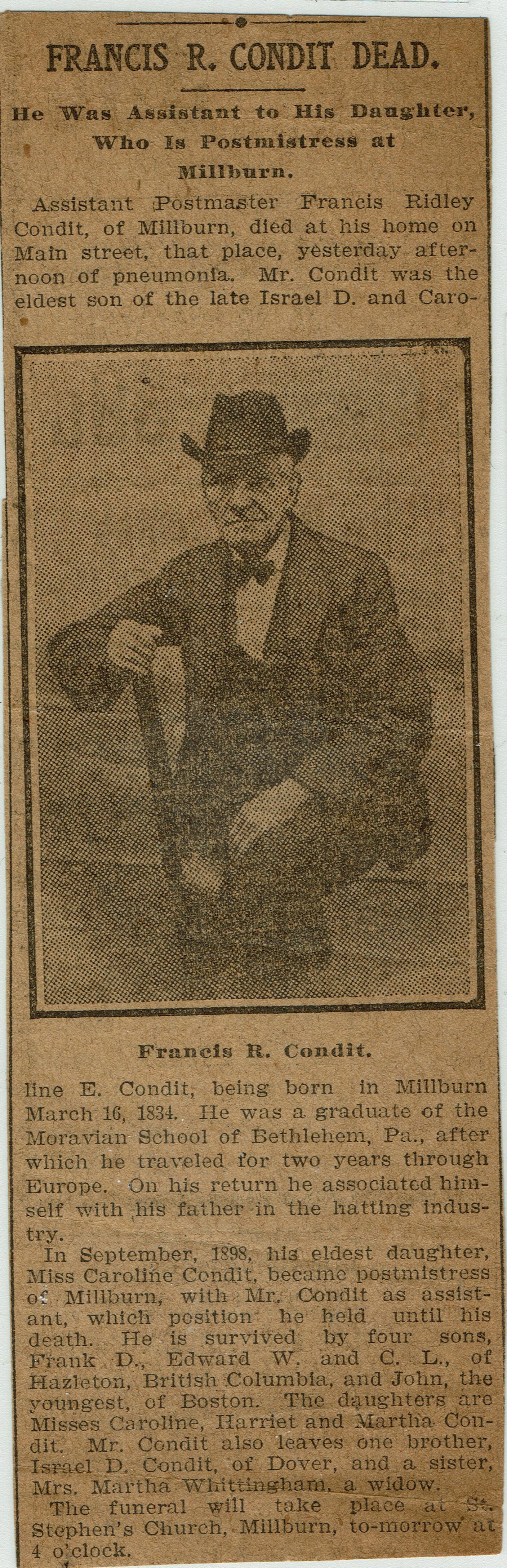 Clipping from the Newark Evening News with the obituary of Francis R. Condit, who died on May 14, 1907. Francis Condit was the son of Israel and Caroline Condit.