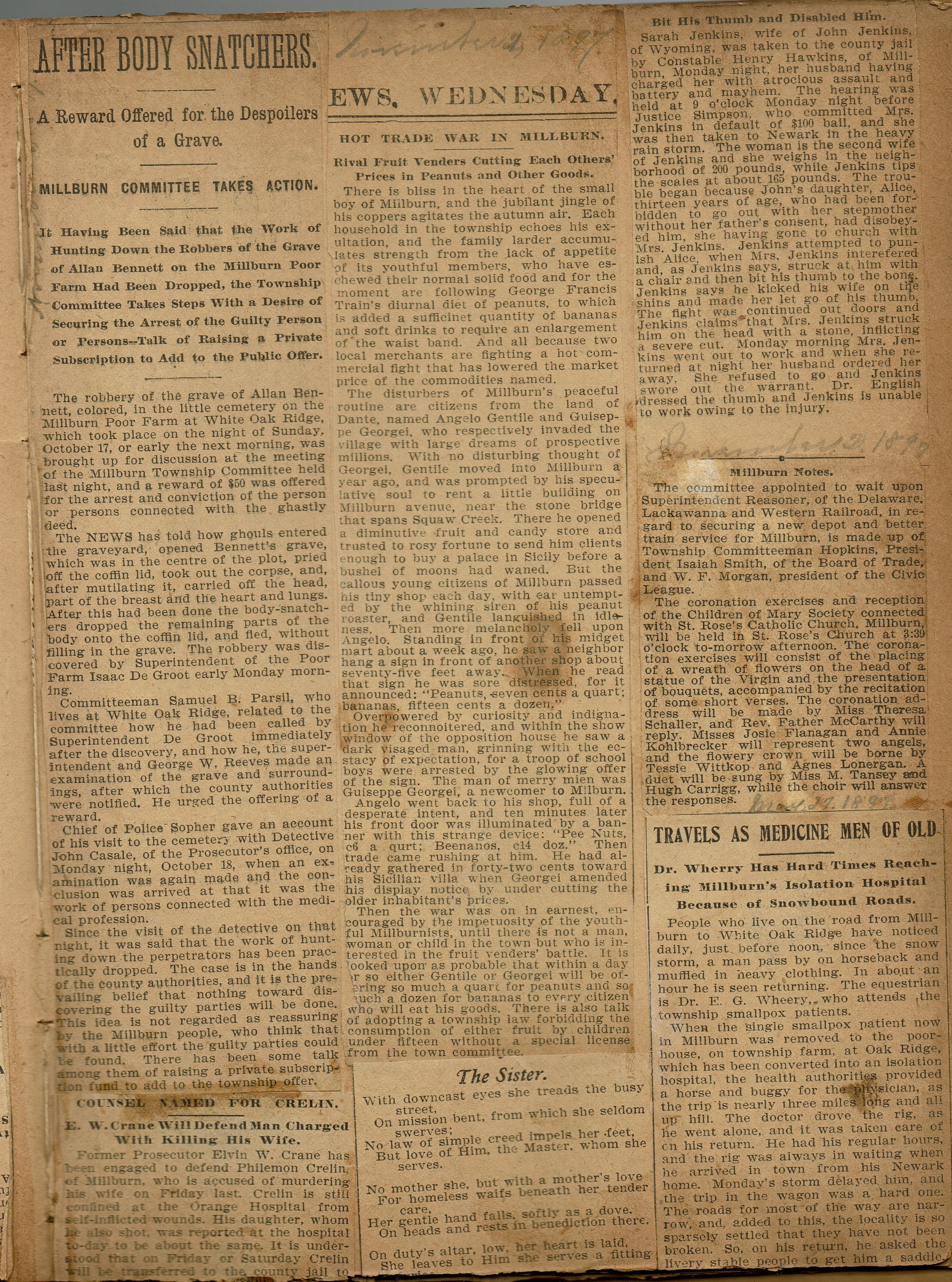 Newspaper clippings from page 23 of the scrapbook belonging to the Flanagan family (44 Mechanic Street, Millburn). Topics covered include reward offered for capture of the person who robbed Allan Bennett's grave, marital dispute between Sarah and John Jenkins of Wyoming, rival Italian grocers Angelo Gentile & Guiseppe Georgei (November 2, 1897), new train depot for Millburn (November 2, 1898), Dr. E. G. Wheery.Collection