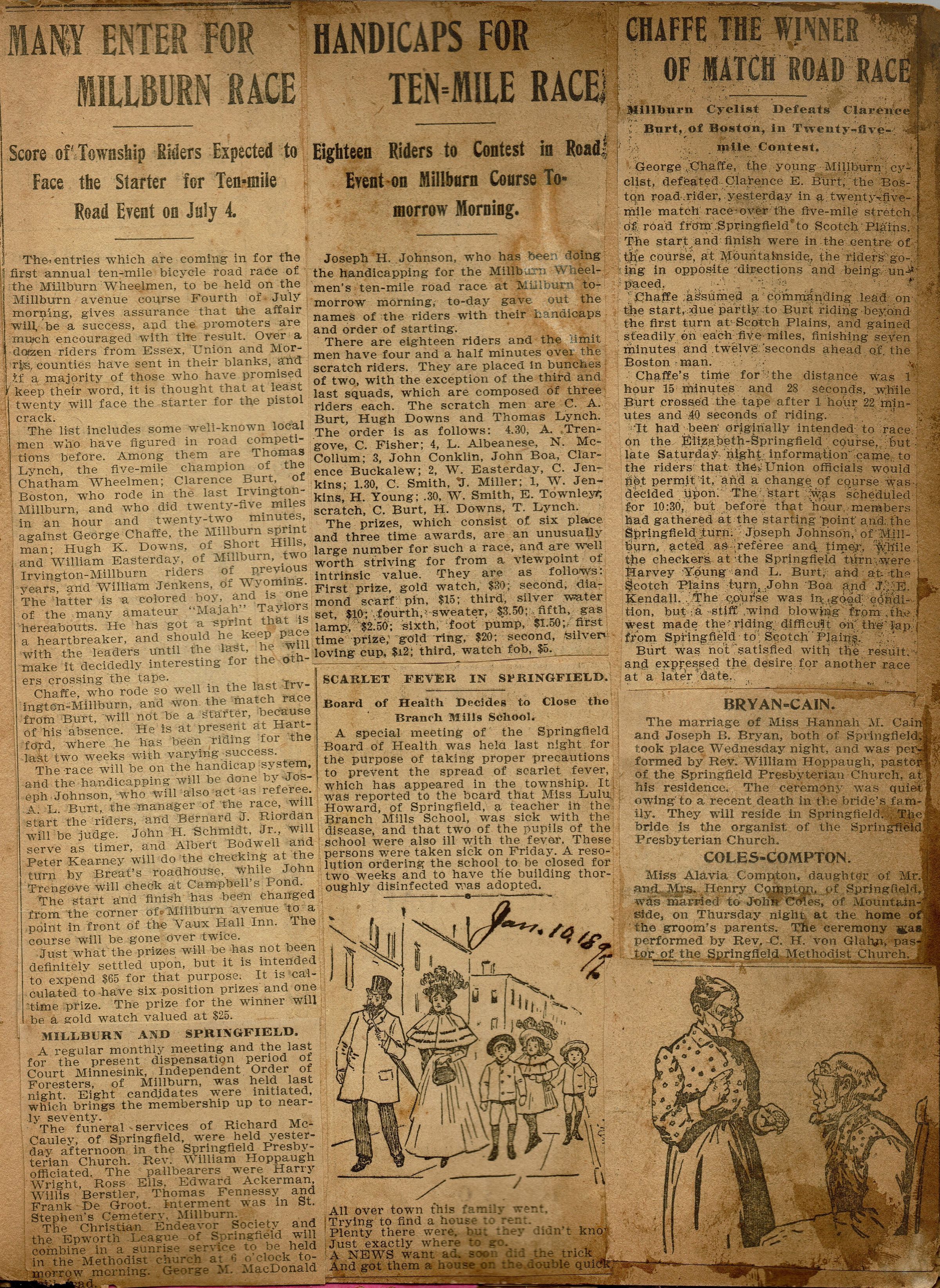 Newspaper clippings from page 16 of the scrapbook belonging to the Flanagan family (44 Mechanic Street, Millburn). Topics include the 10 mile bicycle race of the Millburn Wheelmen, Millburn resident George Chaffe victory.Collection