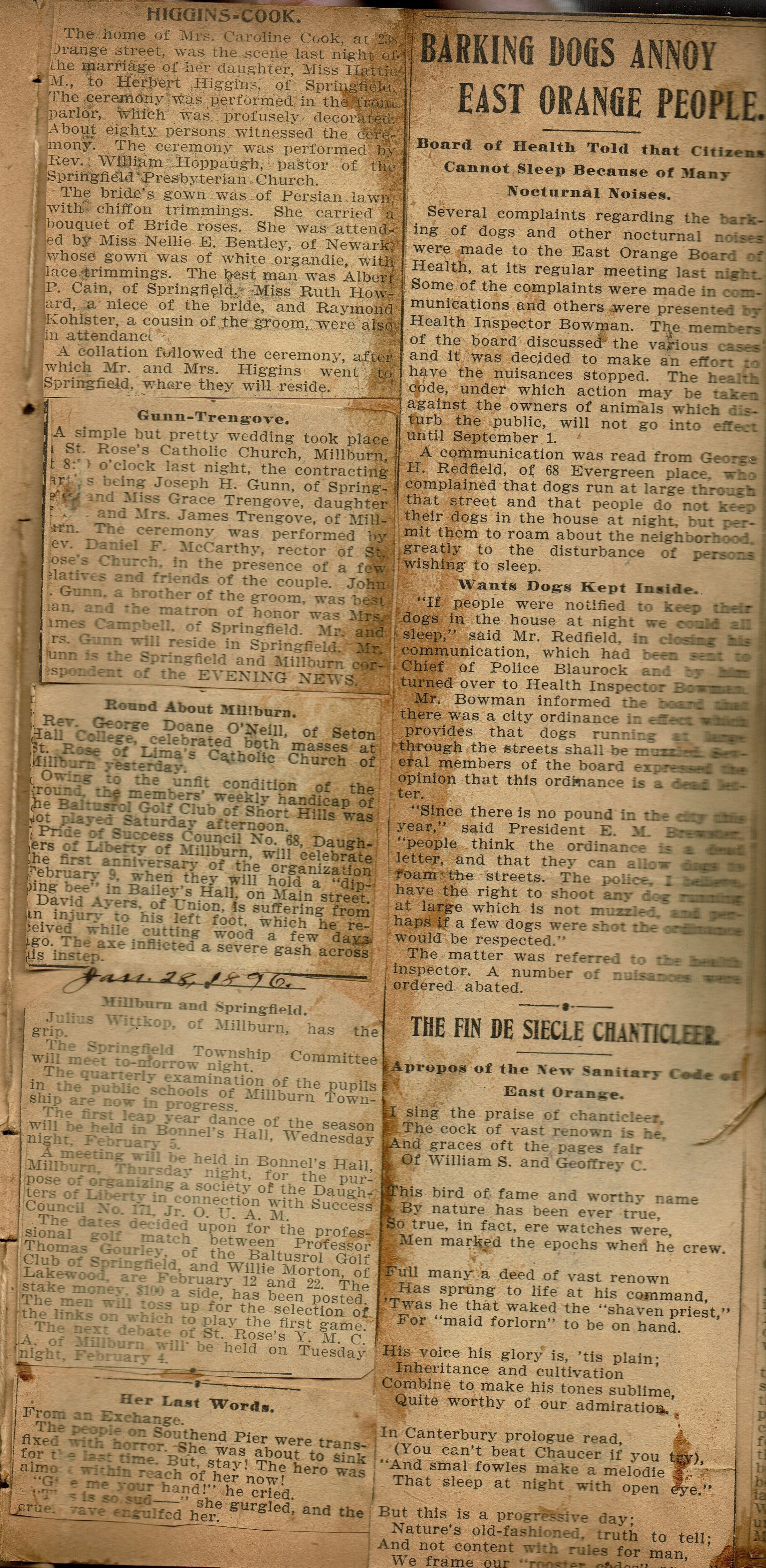 Newspaper clippings from page 7 of the scrapbook belonging to the Flanagan family (44 Mechanic Street, Millburn). Topics include events at Bonnel's Hall in Millburn (1896), Joseph Gunn and Grace Trengrove Wedding at St. Rose, Pride Success Council #68, Daughters of Liberty of Millburn's First Anniversary celebration at Bailey's Hall on Main Street.Collection