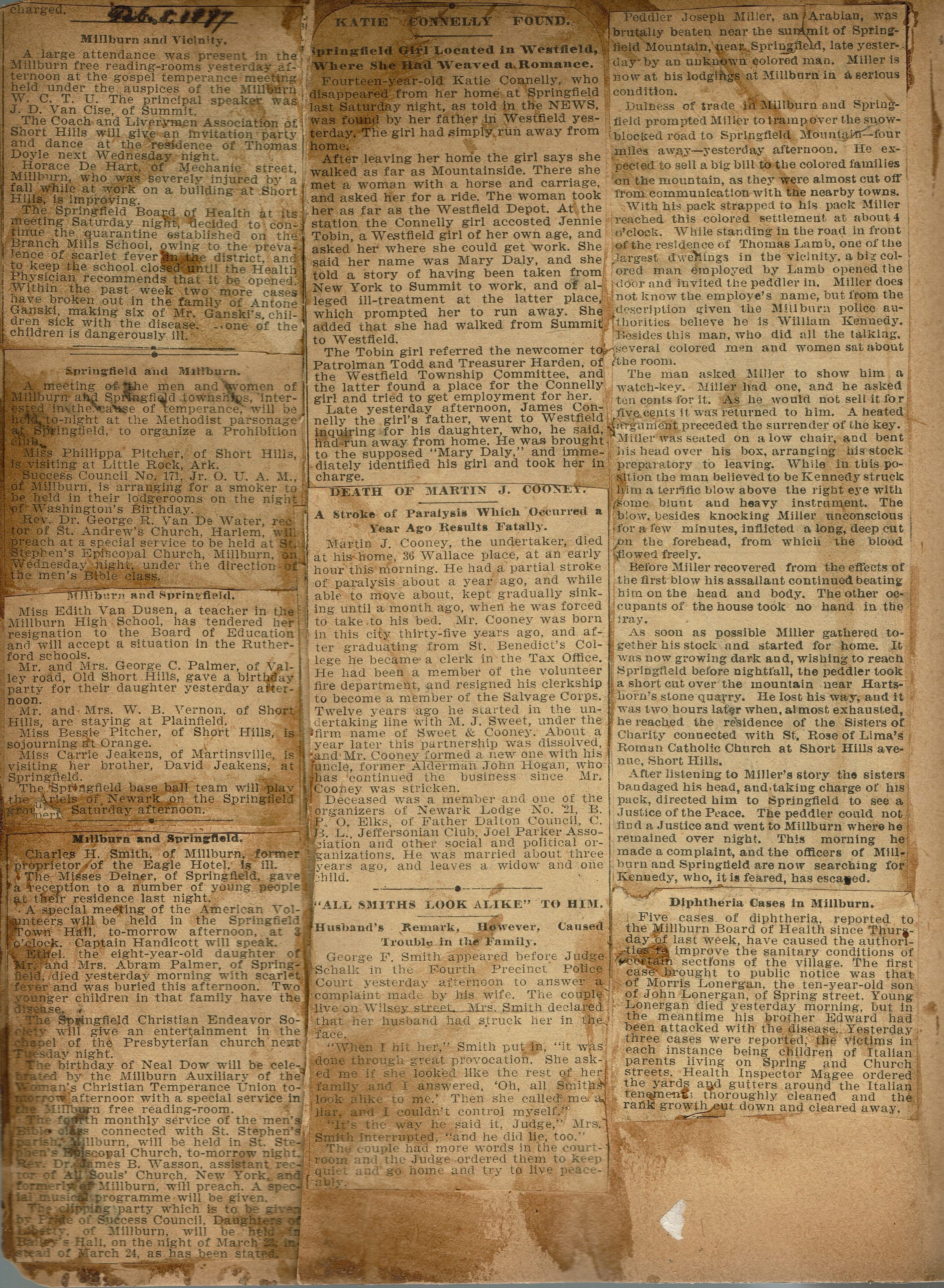 After listening to Miller’s story the sisters bandaged his head, and taking charge of his pack, directed him to Springfield to see a Justice of the Peace. The peddler could not find a Justice and went to Millburn where he remained over night. This morning he made a complaint, and the officers of Millburn and Springfield are now searching for Kennedy, who, it is feared, has escaped.