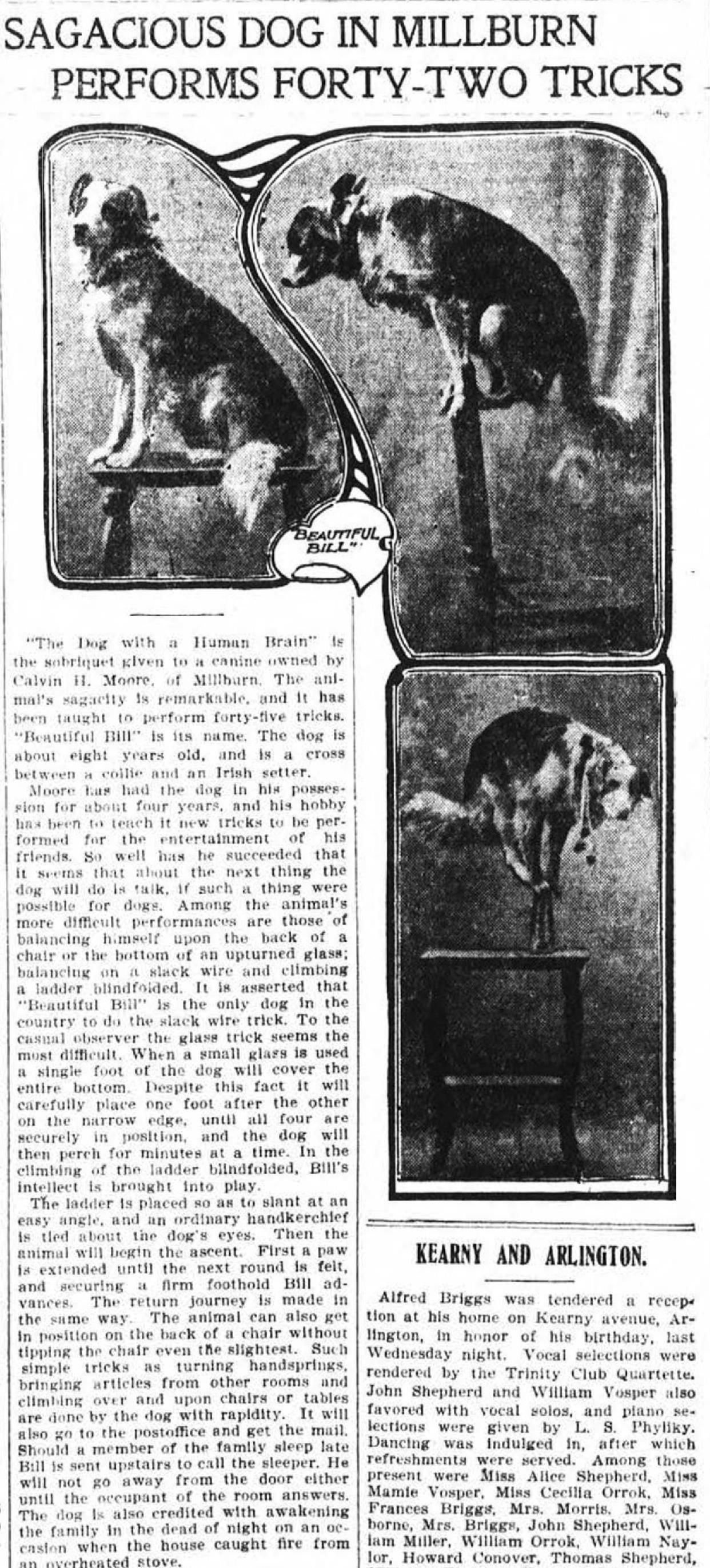 Newspaper clippings from page 32 of the scrapbook belonging to the Flanagan family (44 Mechanic Street, Millburn). Topics include an article entitled "Sagacious Dog in Millburn Performs Forty-Two Tricks" (Newark Evening News, Sunday, August 24, 1902,) describing the 8-year-old Collie and Irish Setter cross named Beautiful Bill, owned by Millburn resident Calvin H. Moore.
