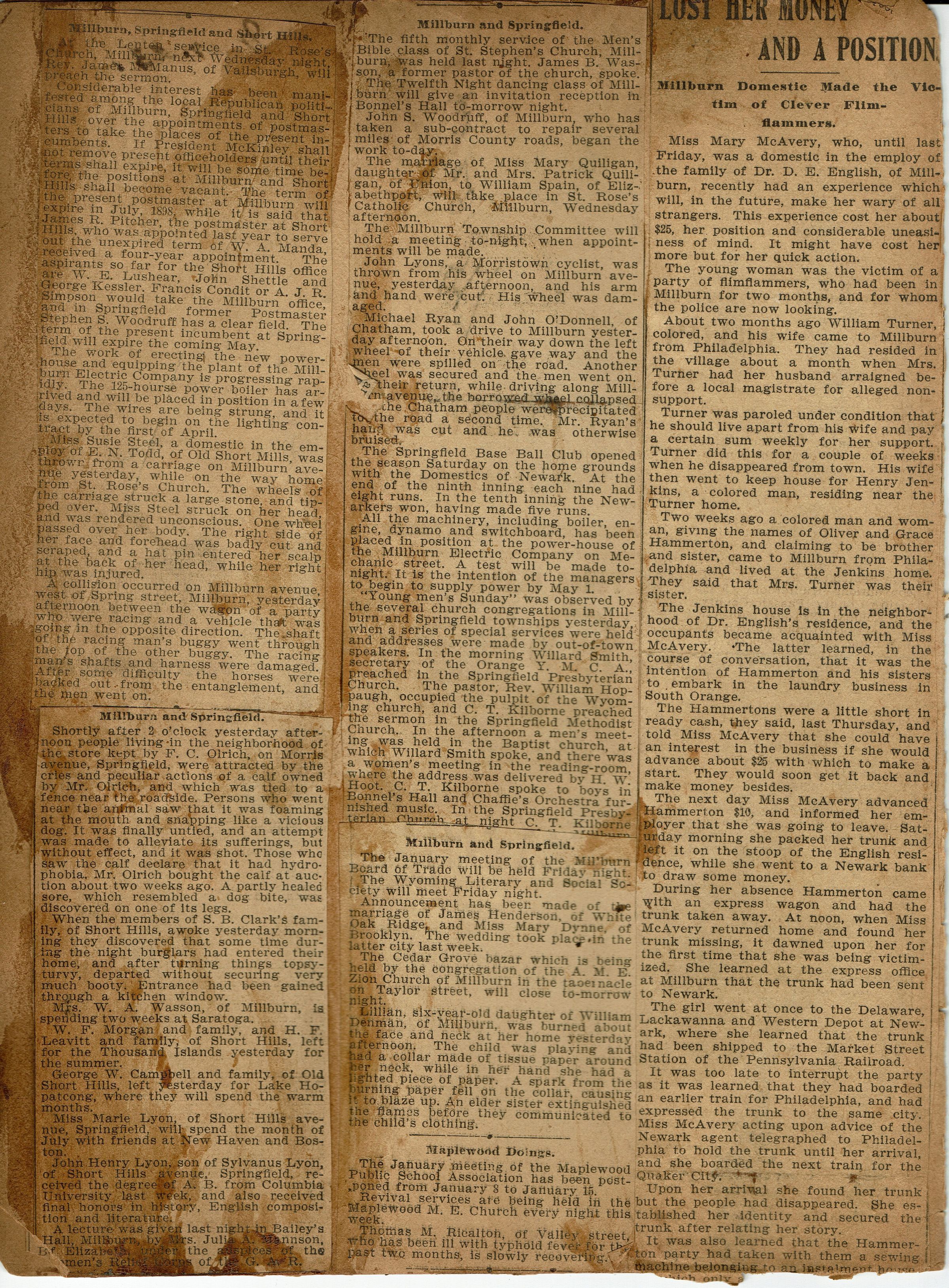 Newspaper clippings from page 4 of the scrapbook belonging to the Flanagan family (44 Mechanic Street, Millburn). Topics covered include: Millburn Postmaster Appointments, James R. Pitcher postmaster in Short Hills in fulfillment of W.A. Manda's term, New Powerhouse and Plant of Millburn Electric Company, John Woodruff work on Morris County Road Repairs, Wyoming Literary and Social Society, Cedar Grove bazar (sic) at A.M.E Zion Church on Taylor Street, Robbery of Mary McAvery servant to Dr. D.E. English.Collection