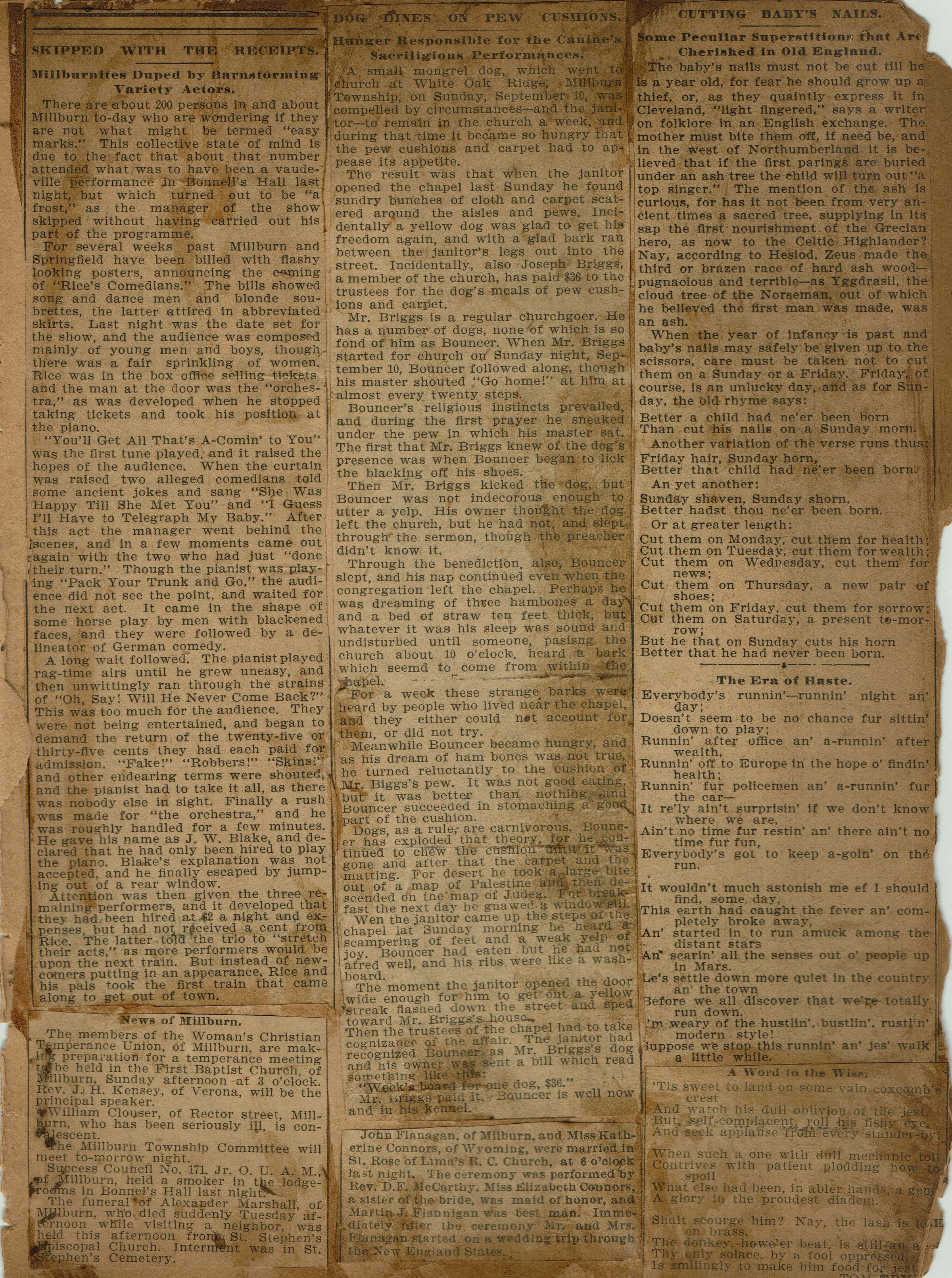 Newspaper clippings from detached page of the scrapbook belonging to the Flanagan family (44 Mechanic Street, Millburn). Topics include scam performance by Rice's Comedians at Bonnell's Hall (September 22, 1899), Woman's Christian Temperance Union, funeral of Alexander Marshall, marriage of John Flanagan and Mis Katherine Connors of Wyoming at St. Rose.Collection