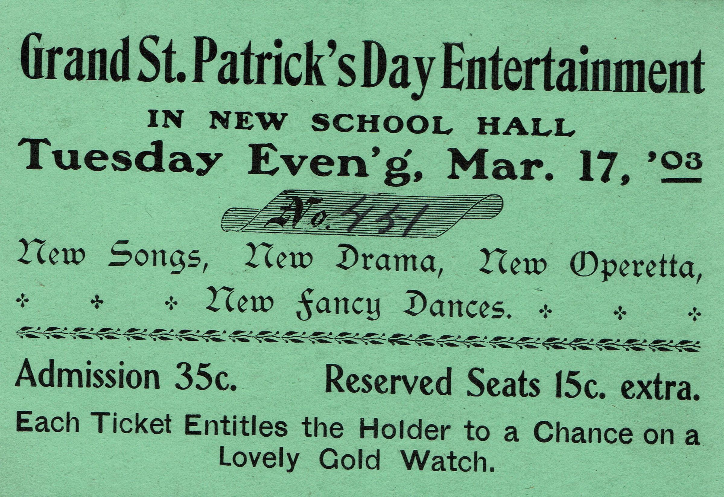 Materials relating to St. Patrick's Day entertainment from the Flanagan collection of ephemera. 1903 ticket to the Grand St. Patrick's Day Entertainment in the new school hall, Tuesday, March 17, 1903 and clipping from the Newark Evening News describing the annual St. Patrick's Day Entertainment of St. Roses' Catholic Church from 1904. Miss Josephine Flanagan was directress of music. Minstrelsy composed the first part with choral selections following.Collection