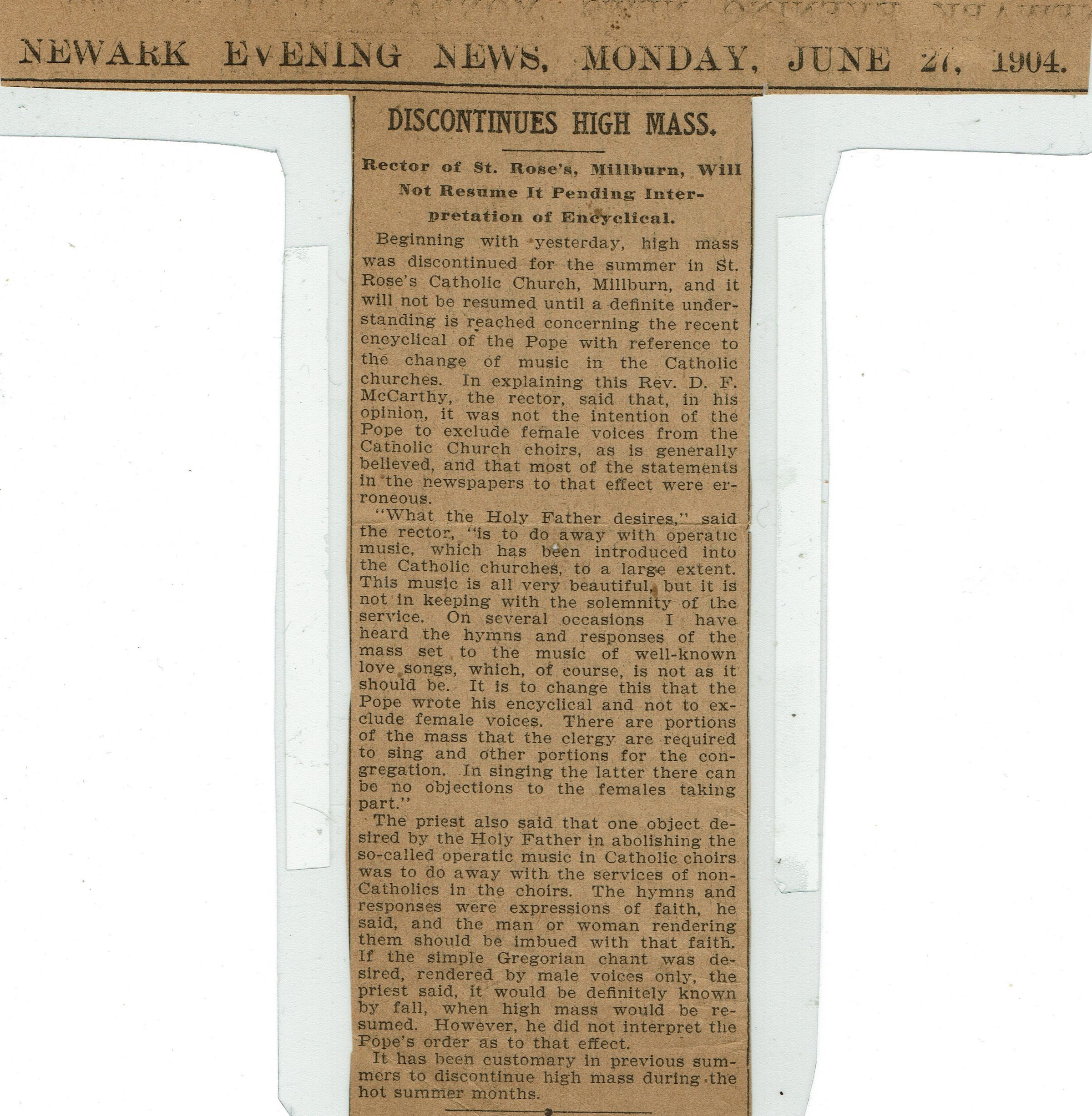 Flanagan: St. Rose Rector Discontinues High Mass, 1904