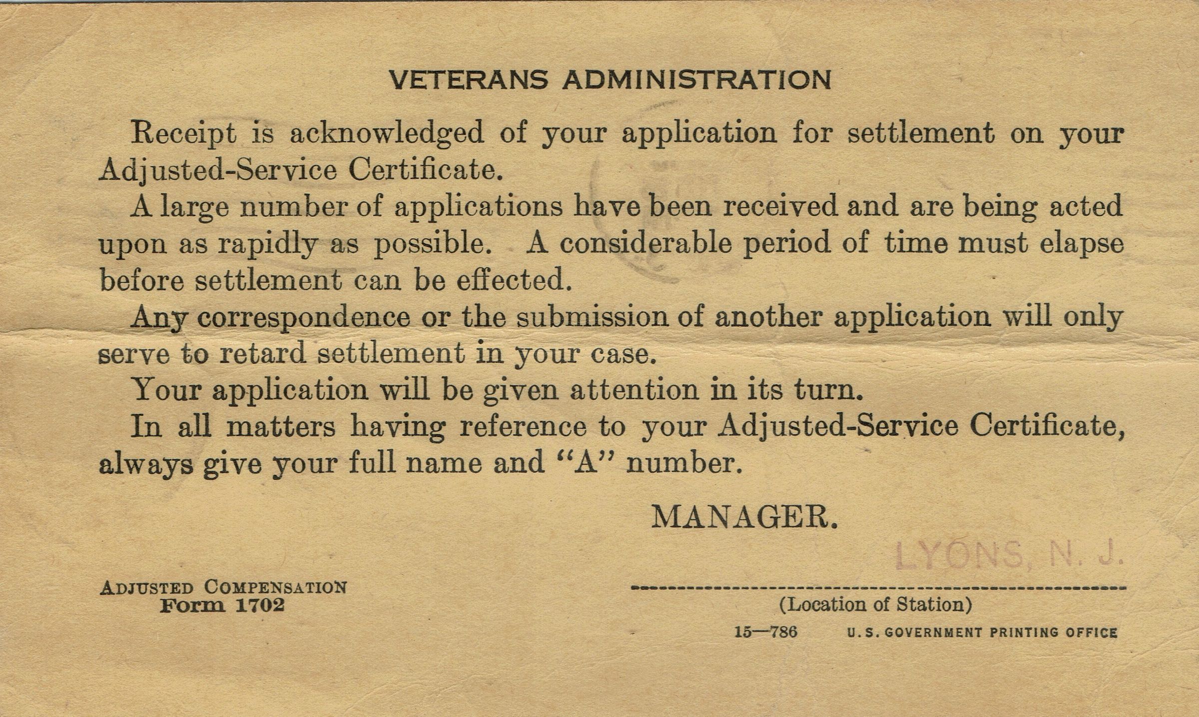 Flanagan: Veterans Administration Application CardsEntry/Object ID