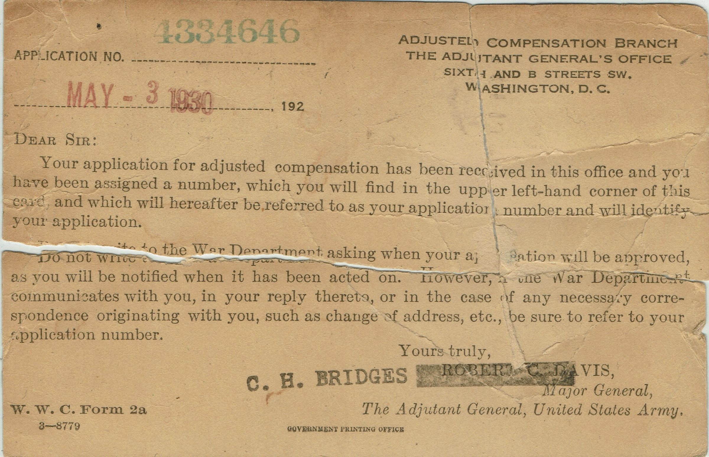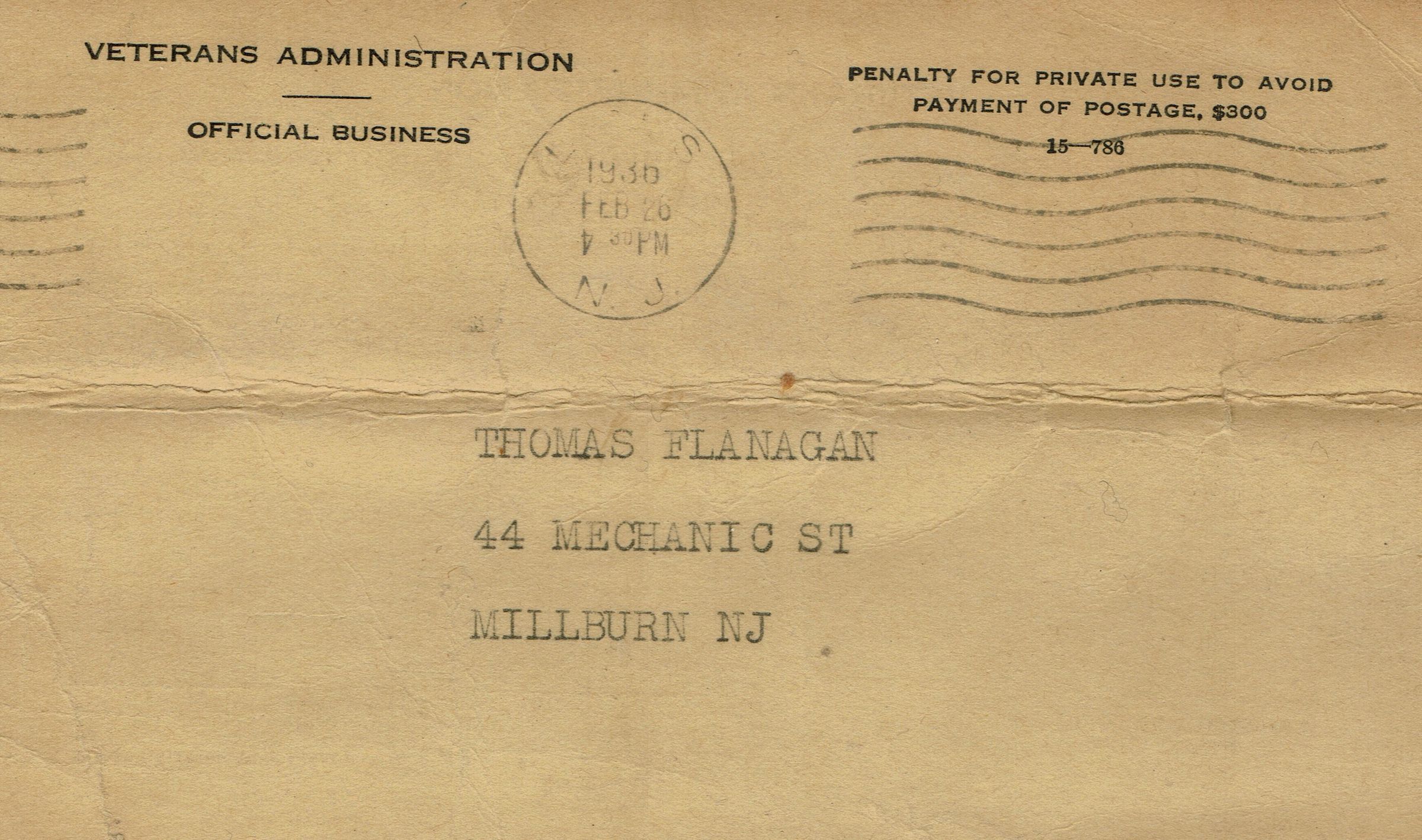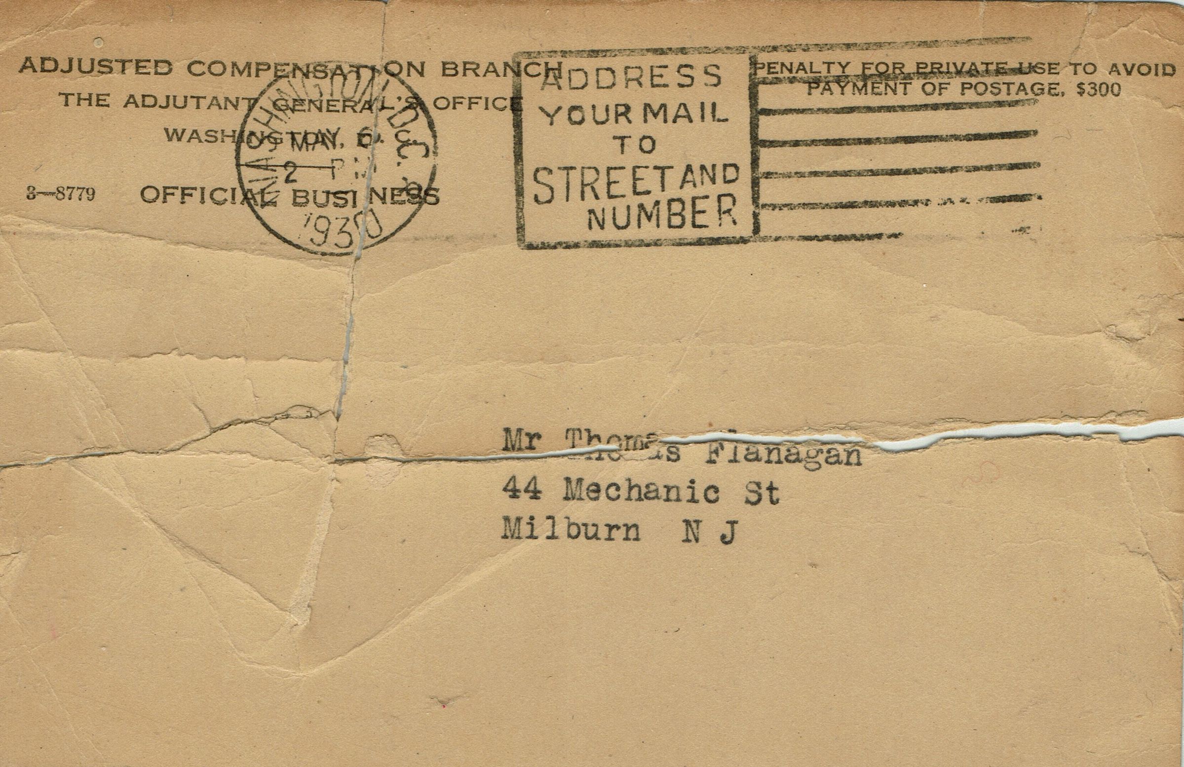 Postally used postcards (2) sent to Thomas Flanagan from the Veterans Administration, postmarked February 26, 1936 and May 6, 1930 regarding settlement of his Adjusted-Service Certificate.Collection