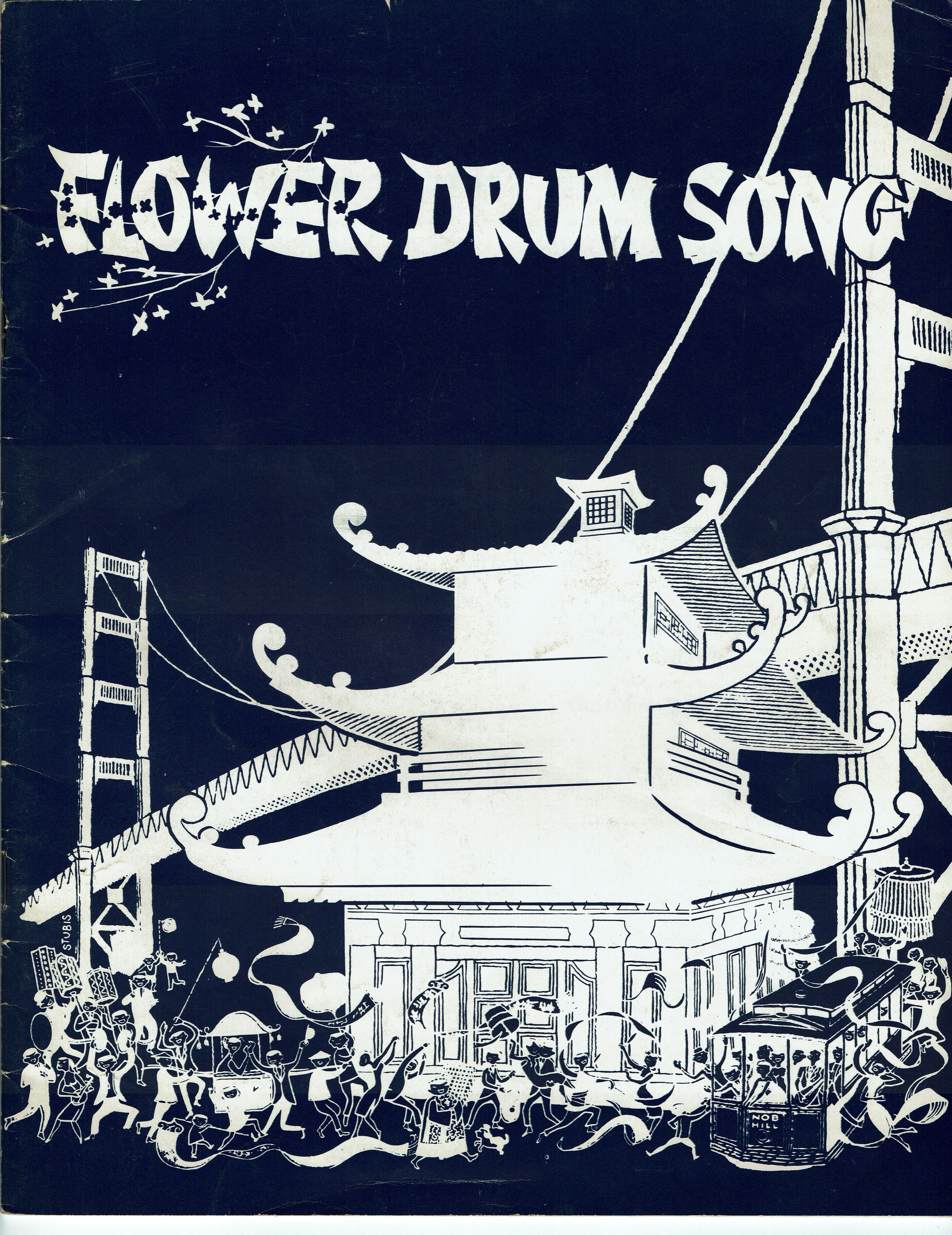 Souvenir Program for 1961 Paper Mill Playhouse Production of "Flower Drum Song" (September 19-October 21) starring Yin Sun, Larry Leung, Maureen Tiongco, Harry Theyard, Ron Beatti and Joy Kim. Deluxe fully illustrated program with photographs of cast members, producers and articles about Paper Mill Playhouse. 21 pp.Dimensions