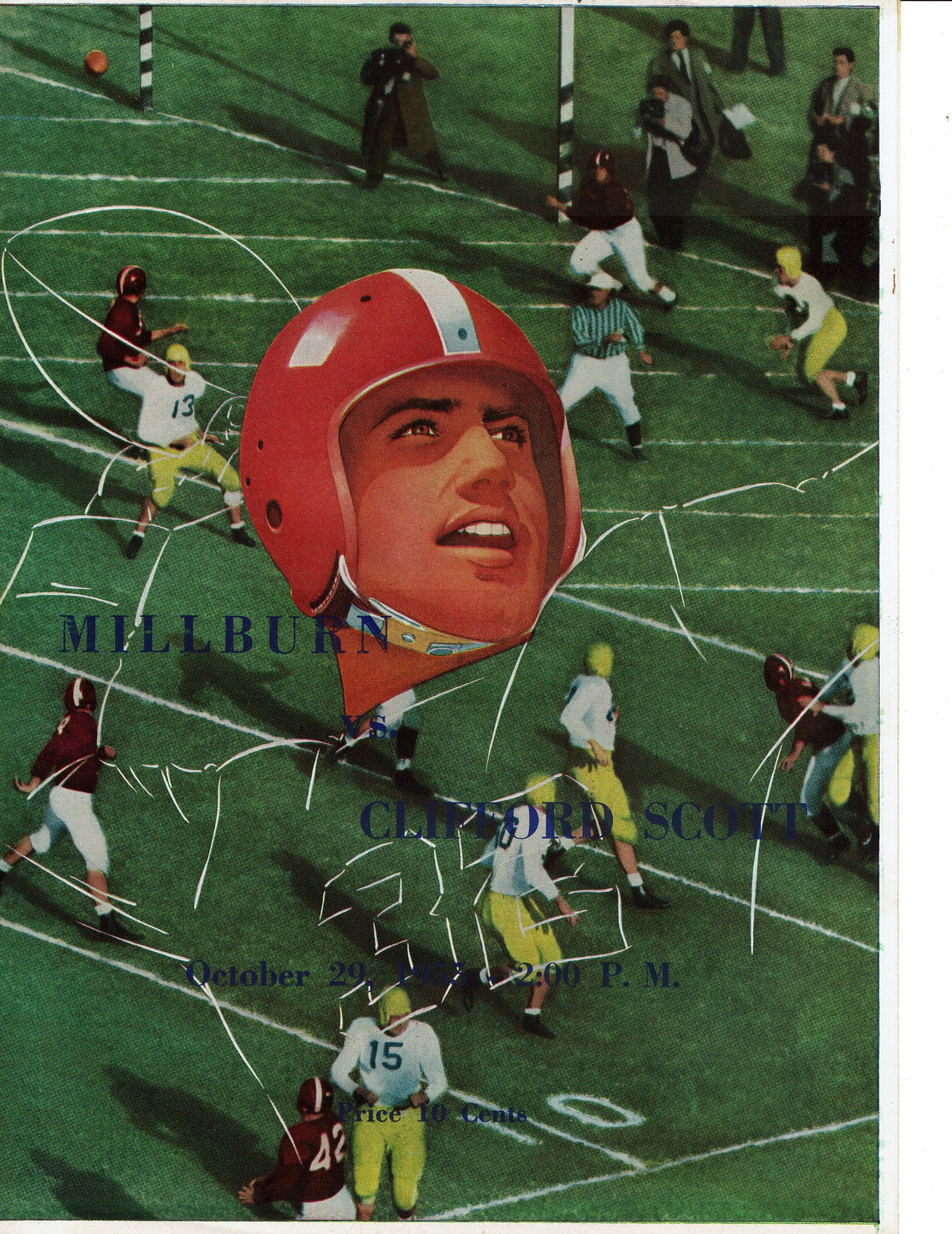 Program for varsity football Millburn vs. Clifford Scott, October 29, 1955. 4 pp. Includes the 1955 Football Schedule and Standings, Clifford Scott and Millburn Line-Ups, and members of the Millburn Marching Band.Acquisition