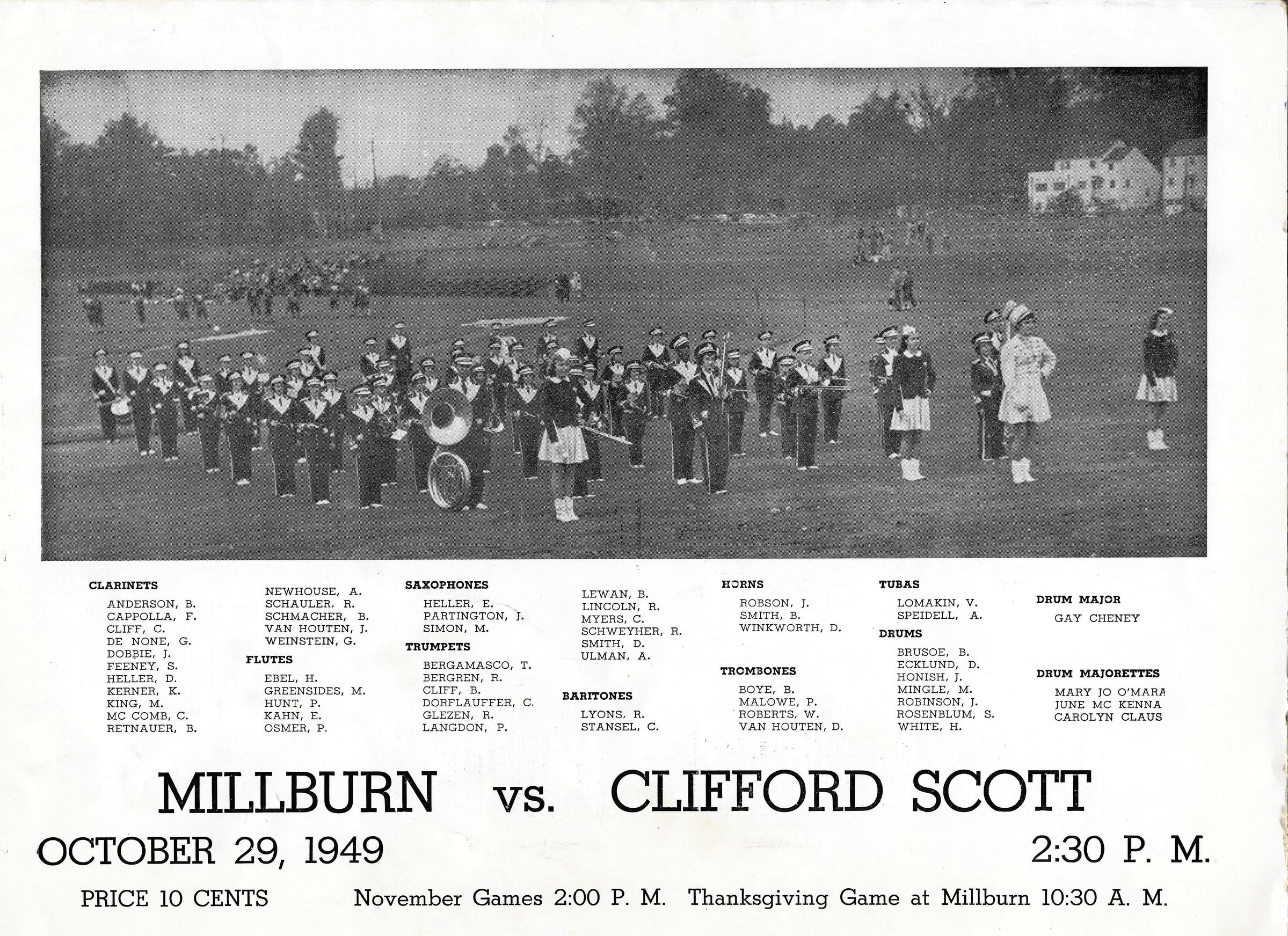 Illustrated Program for the October 29, 1949 football game between Millburn High School and Clifford Scott. 4 pp. Contains list of players, captains, team line-up, 1949 Football Schedule and last season's final conference standings.. Illustrated with photographs and advertisements for Investors Savings & Loan Association and Parkway Radio Service in East Orange.Acquisition
