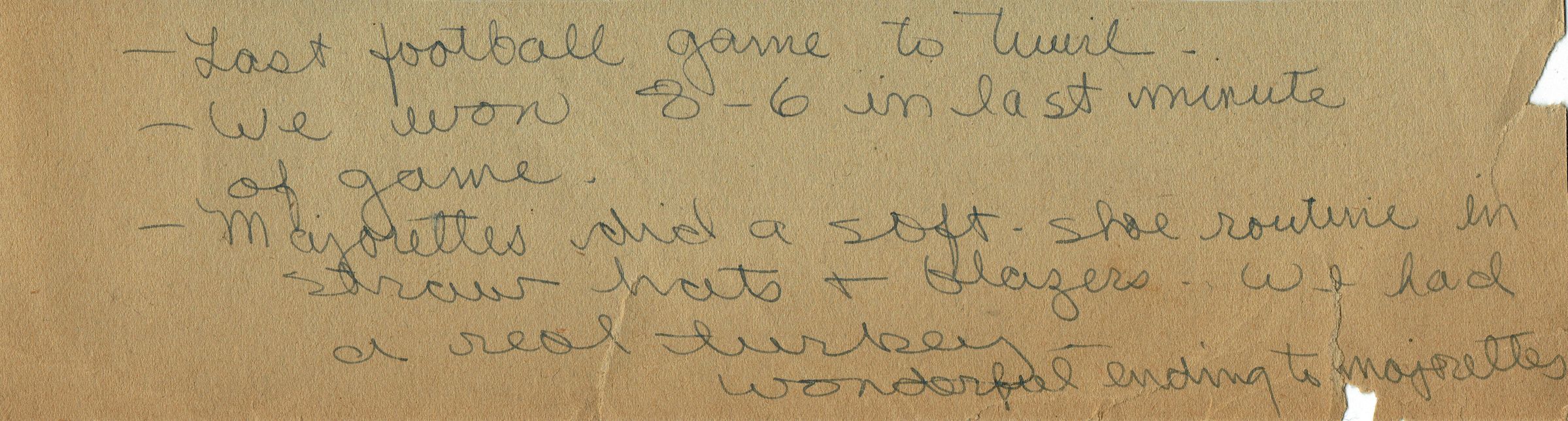 Program for varsity football Millburn vs. Madison, November 26, 1959. Cover design by Fred Fixler. Includes the 1959 Football Schedule and Standings, Madison and Millburn Line-Ups, and members of the Millburn Marching Band. Program was affixed to a scrapbook page at some point. Inscription at bottom of scrapbook page reads: "Last football game to twirl. We won 8-6 in last minute of game. Majorettes did a soft-shoe routine in straw hats and blazers. We had a real turkey. Wonderful ending to majorettes."Acquisition